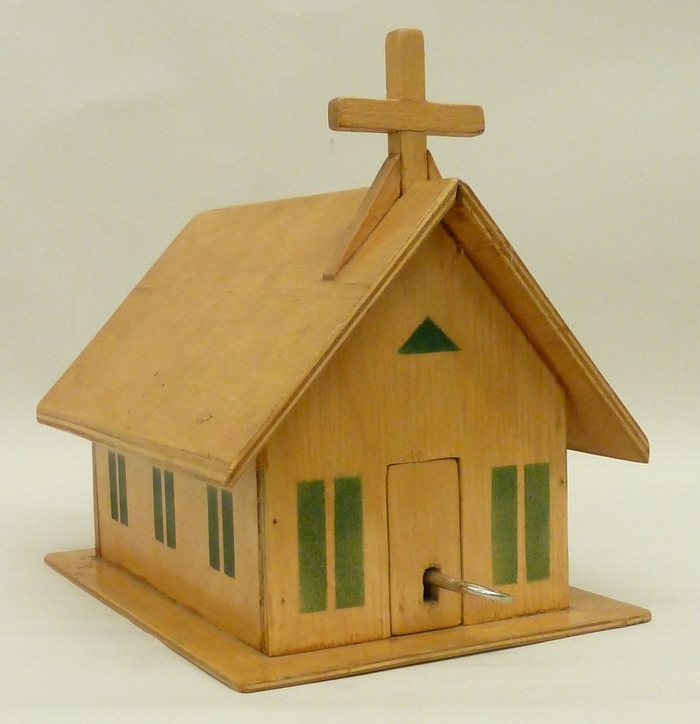 Spaarpot in model van een kerk, uitgegeven door Raad voor de Zending, voor scholen