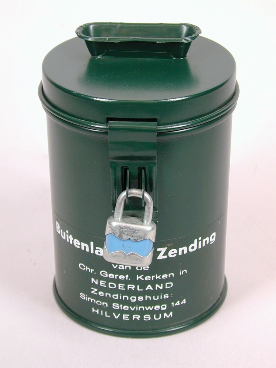 Groen geldbusje met "Buitenlandse Zending van de Chr. Geref. Kerken ..."