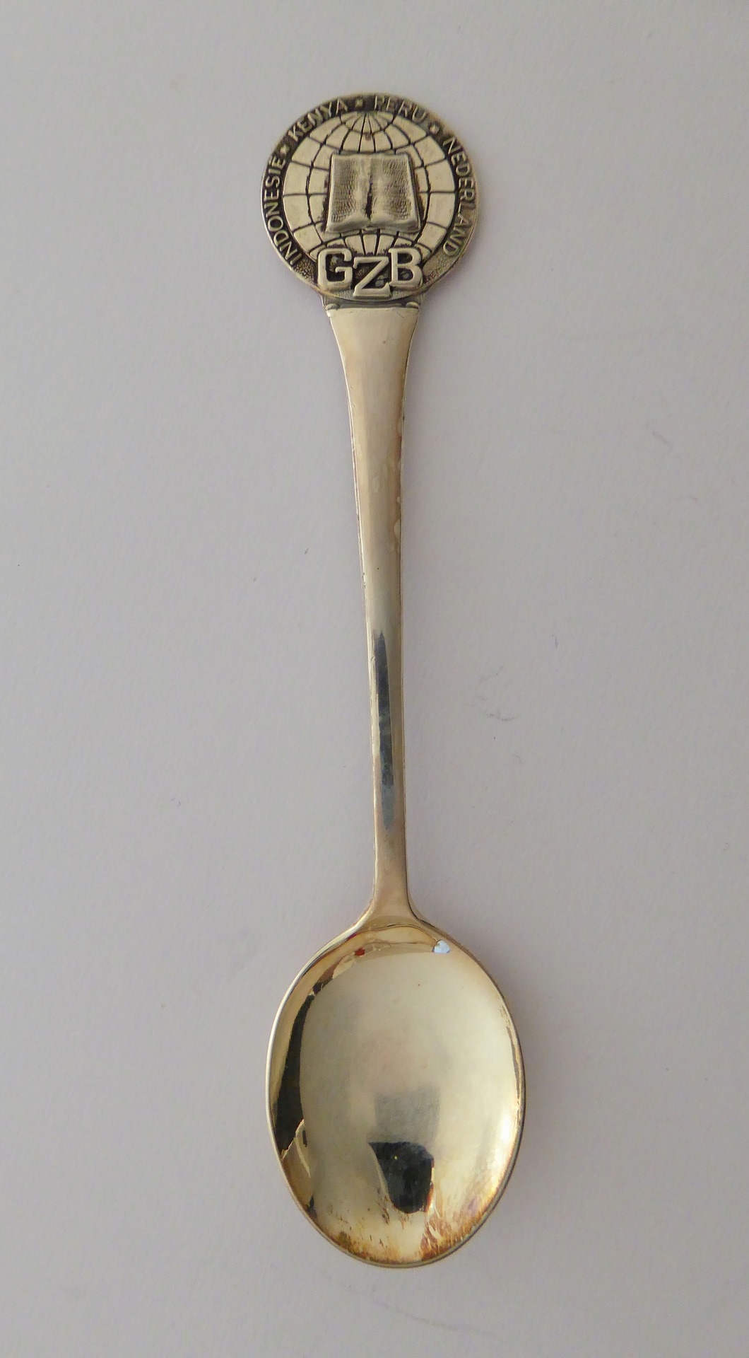 Propagandamateriaal Gereformeerde Zendings Bond: theelepeltje met "Indonesië Kenya Nederland" bijbel