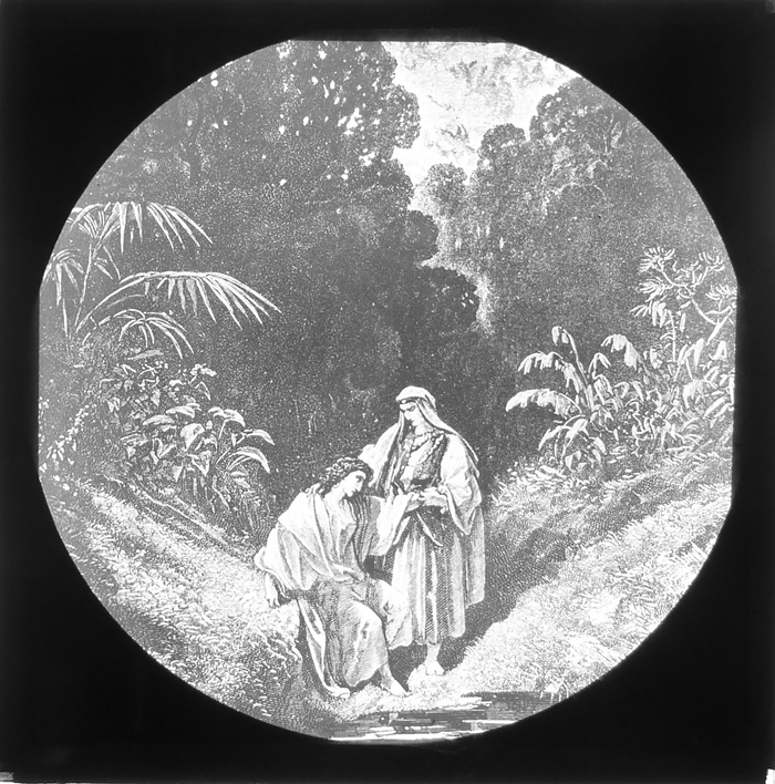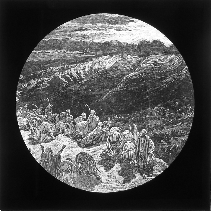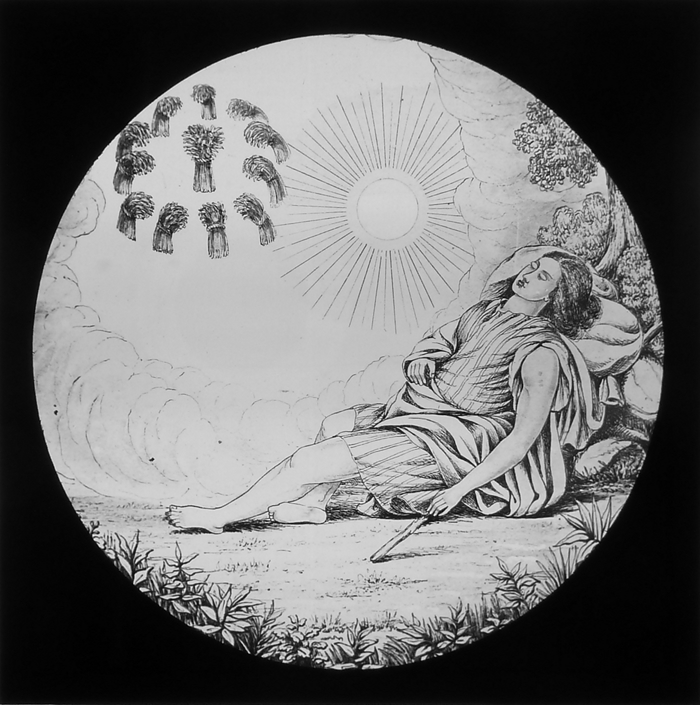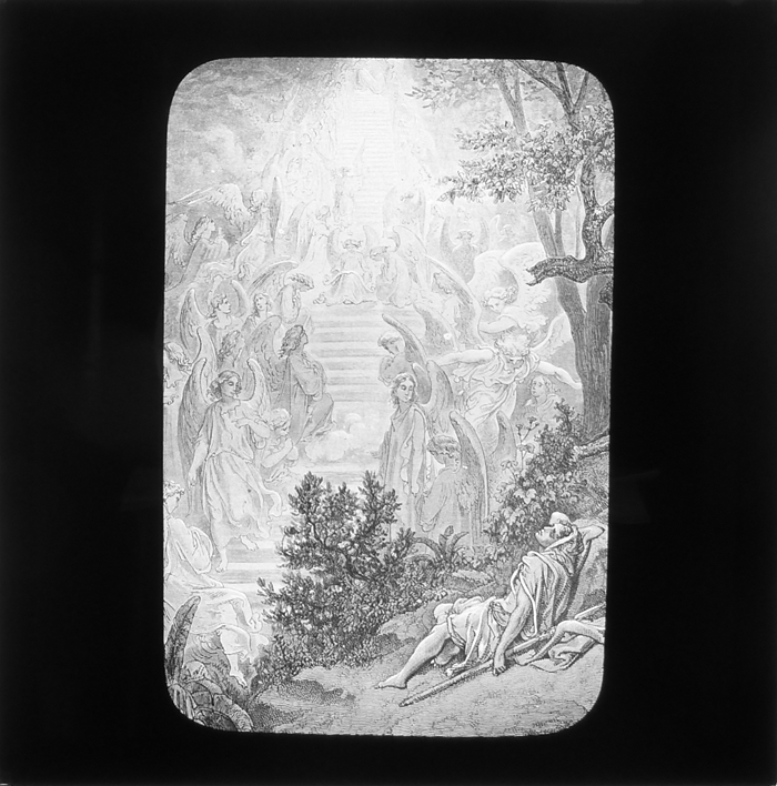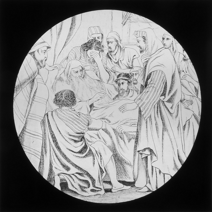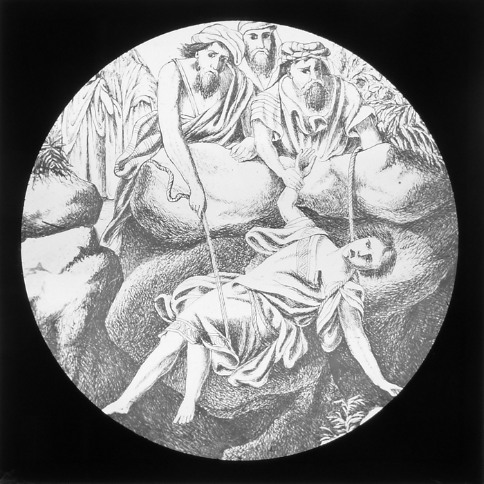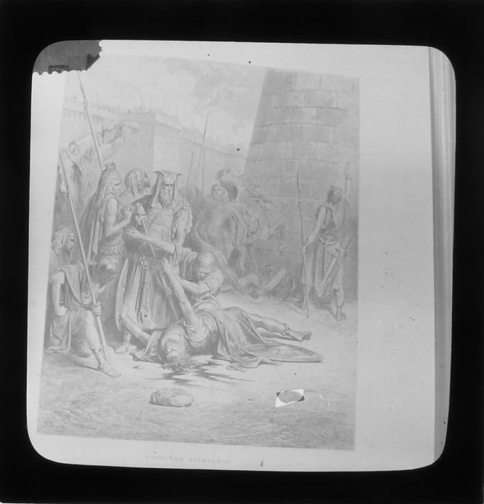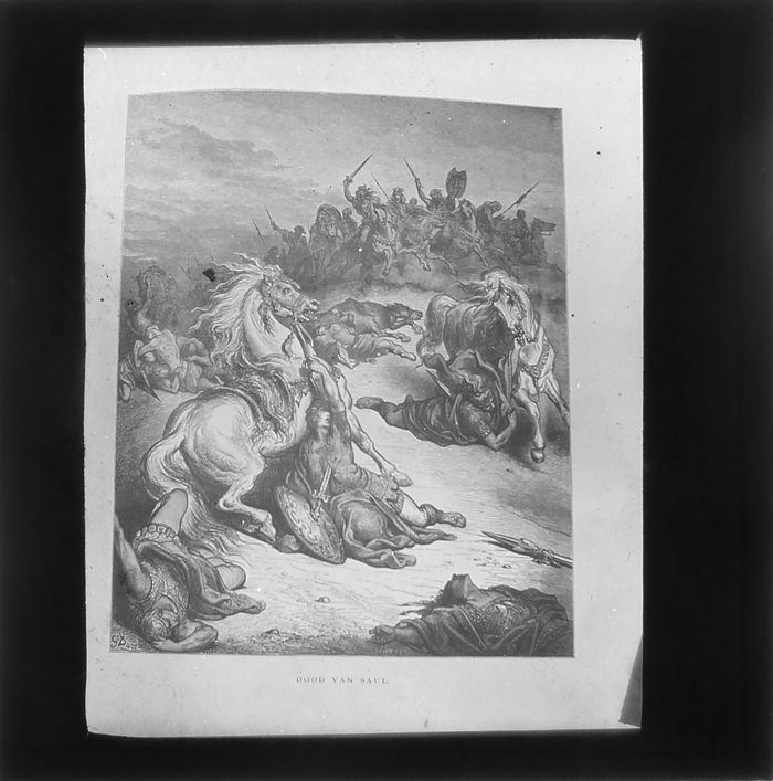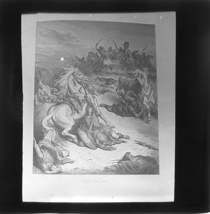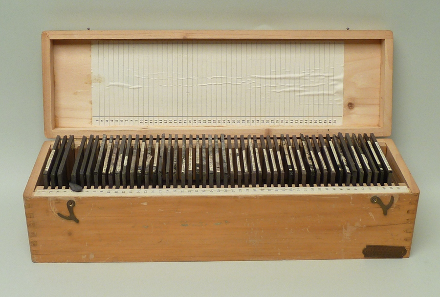 Vijftig lantaarnplaatjes met bijbelse voorstellingen in houten doos
