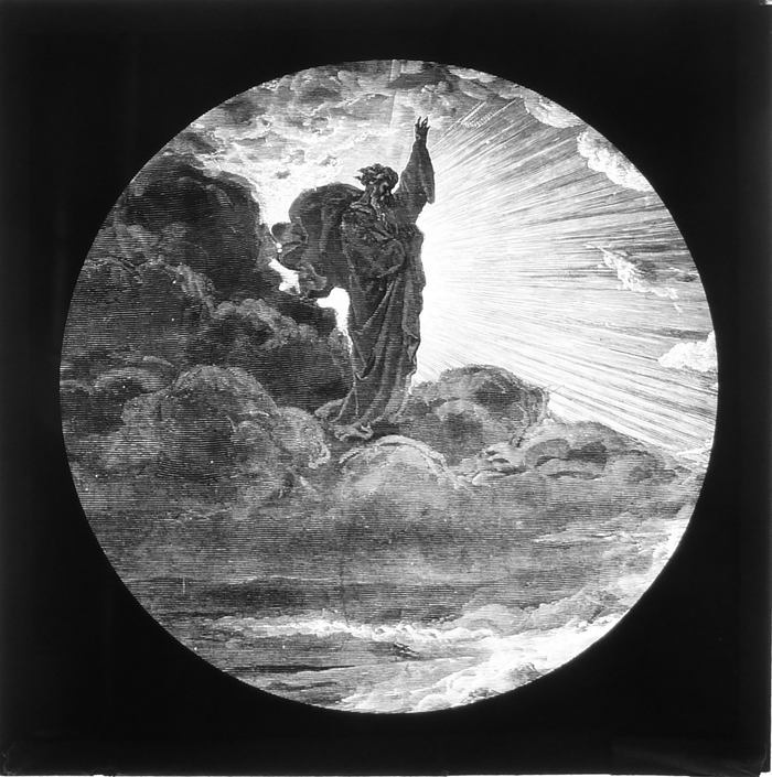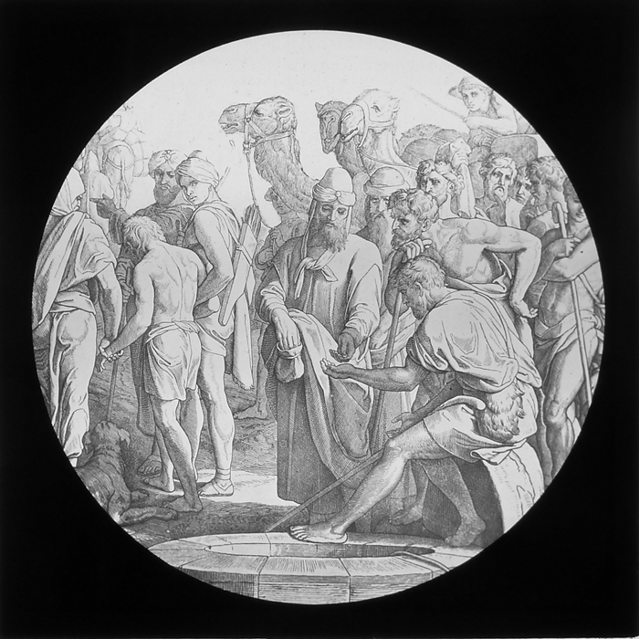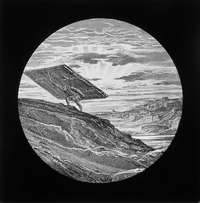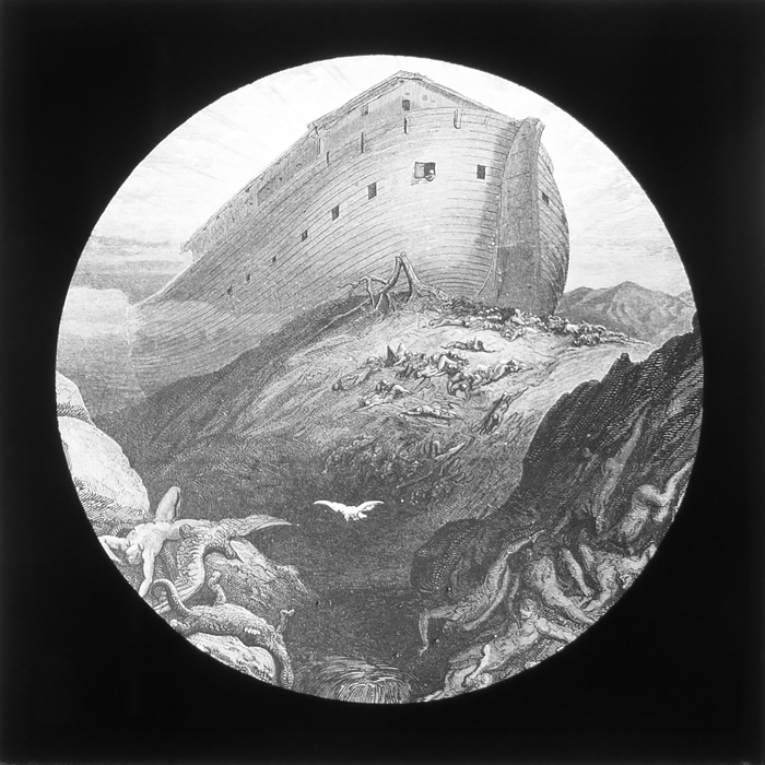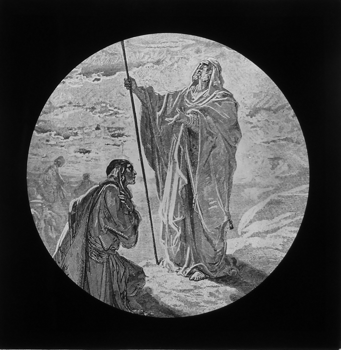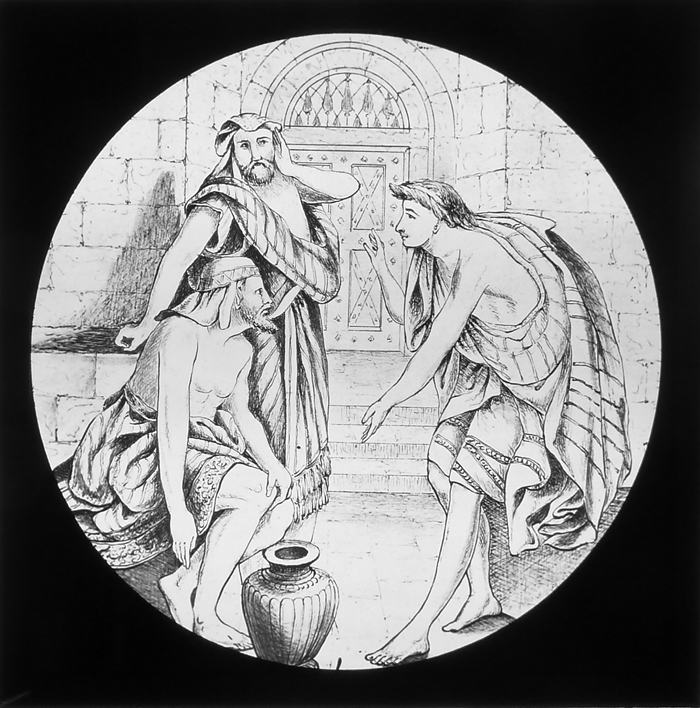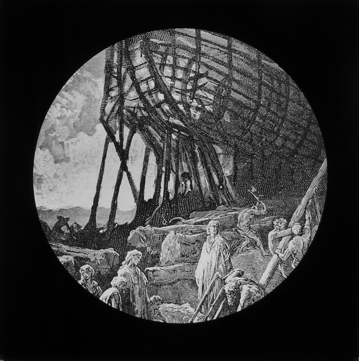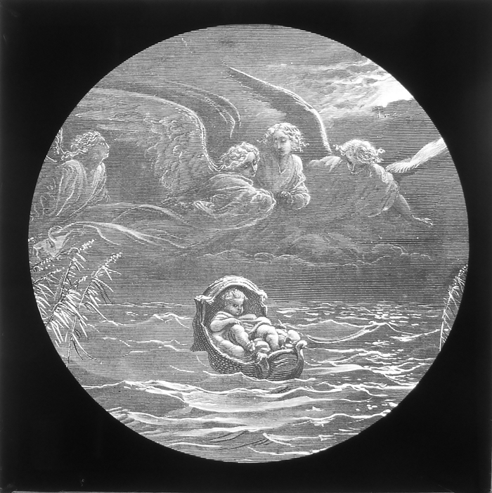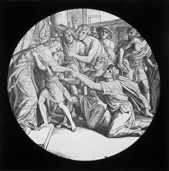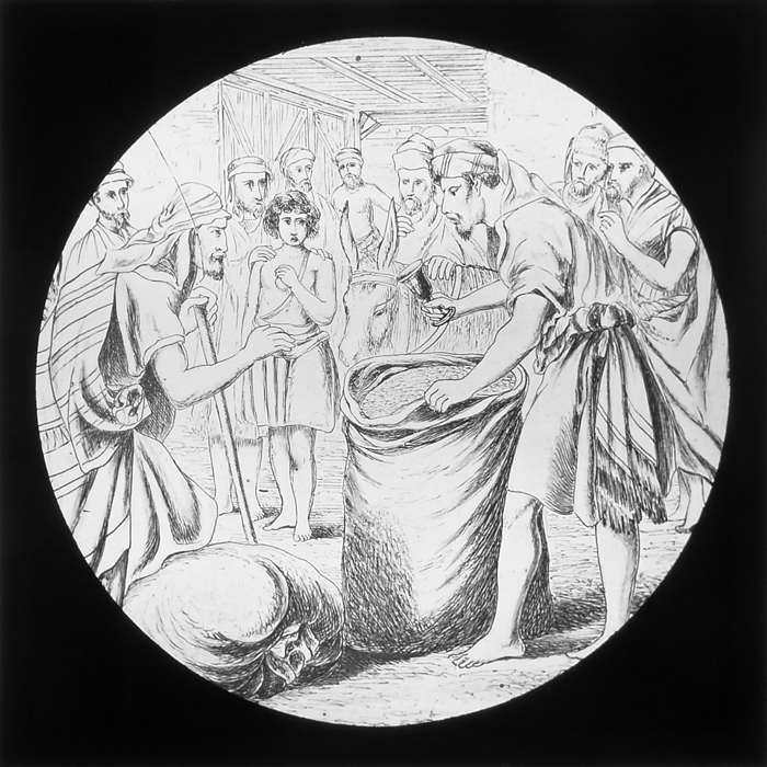 Vijftig lantaarnplaatjes met bijbelse voorstellingen in houten doos