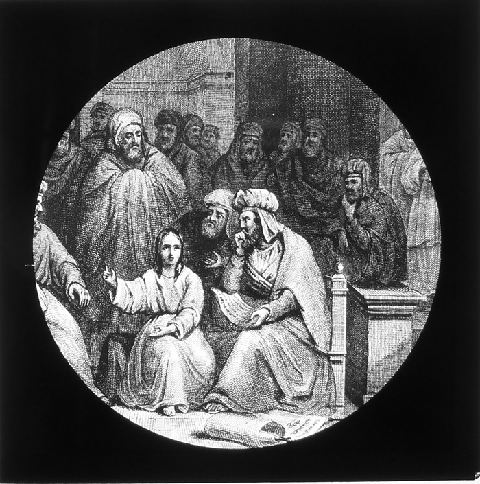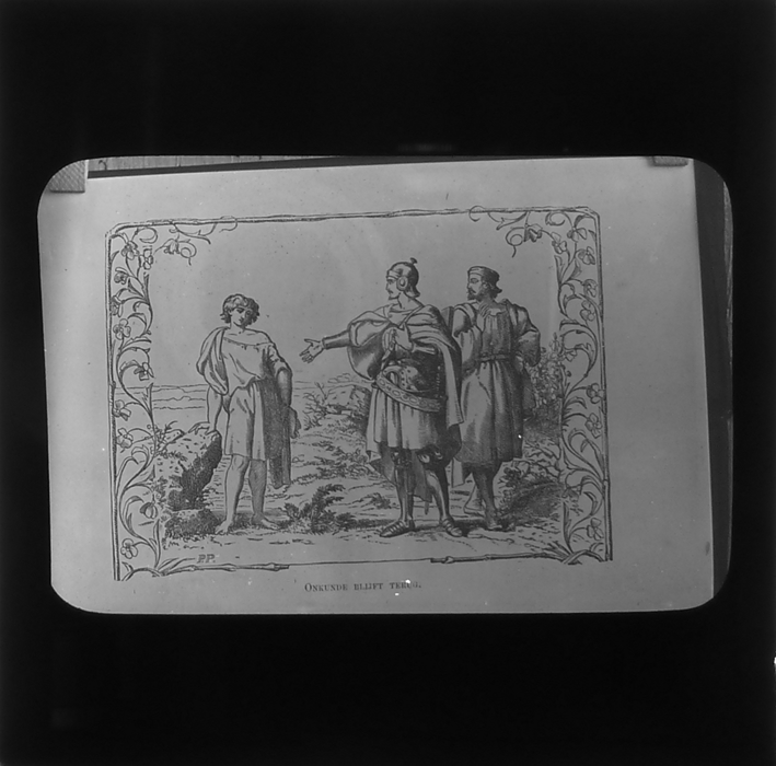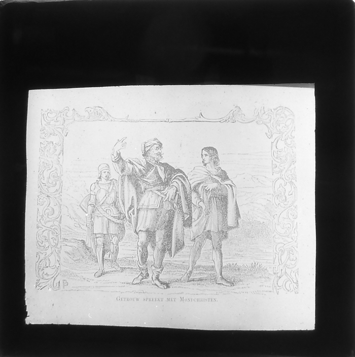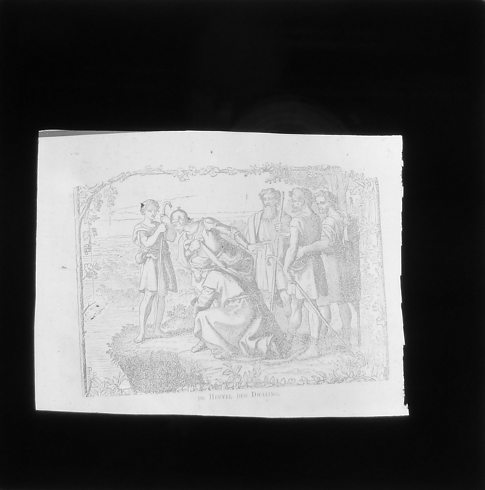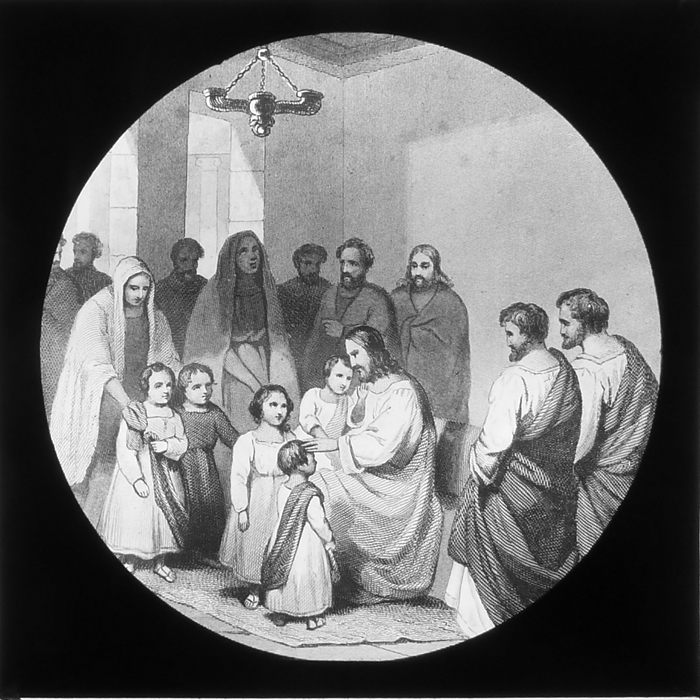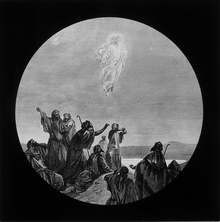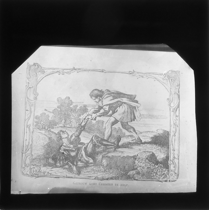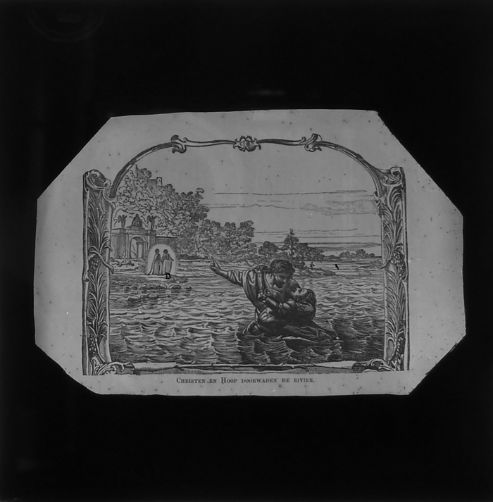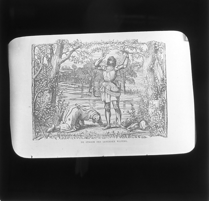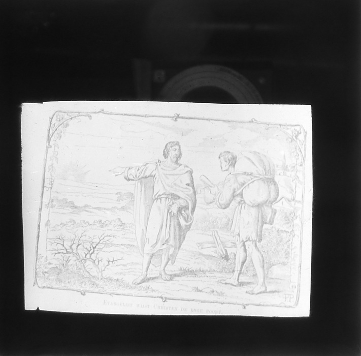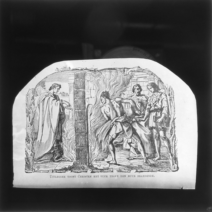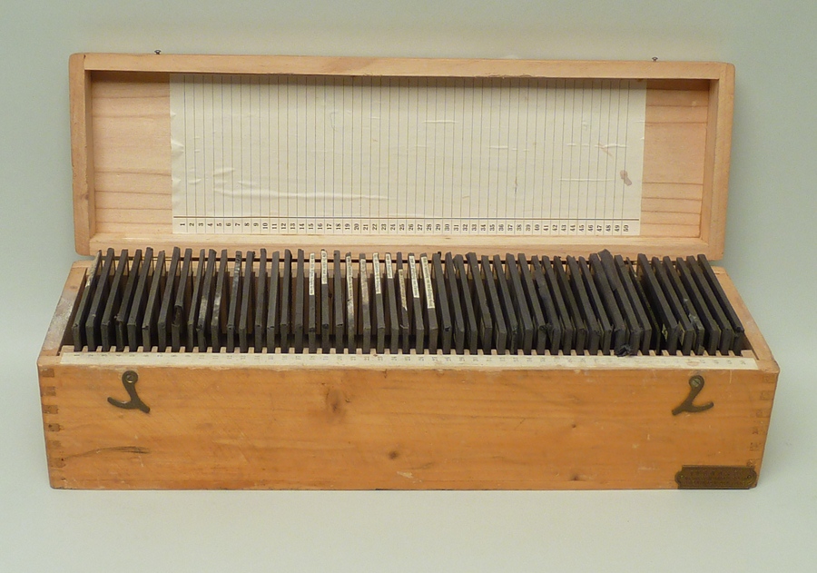 Vijftig lantaarnplaatjes met bijbelse voorstellingen in houten doos