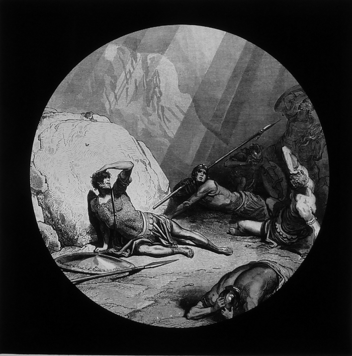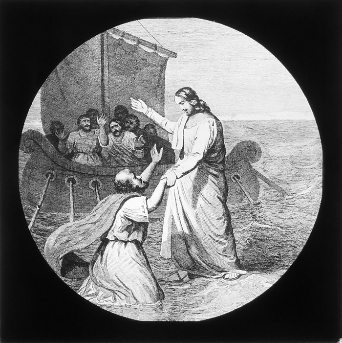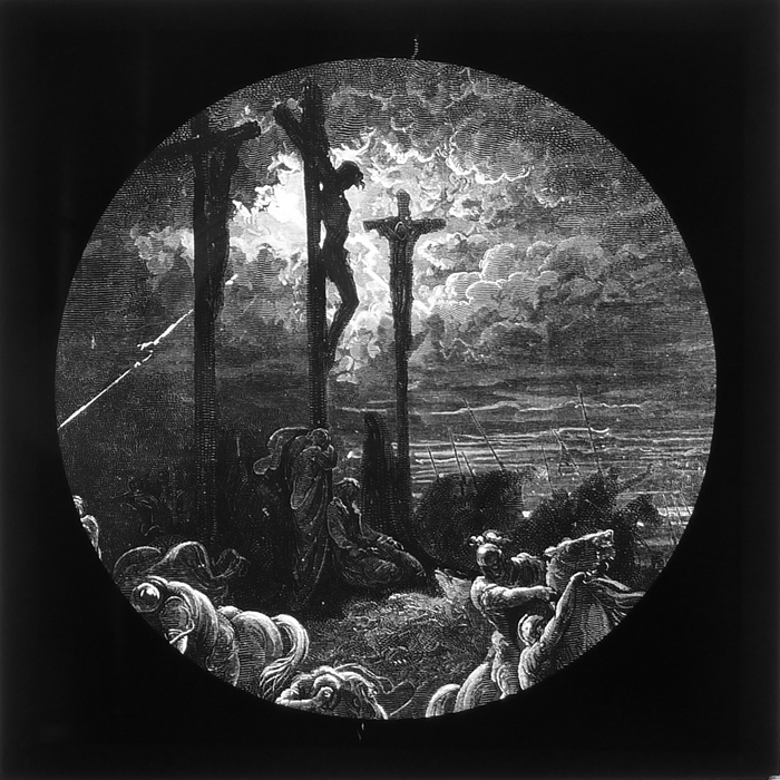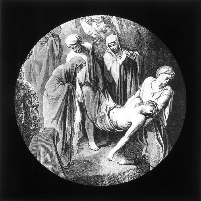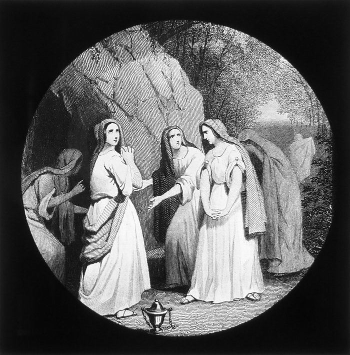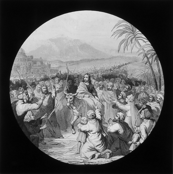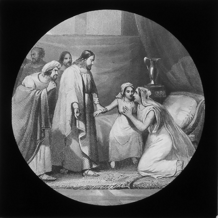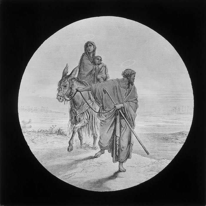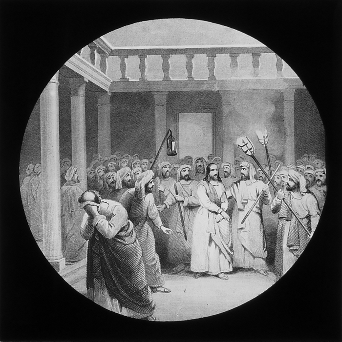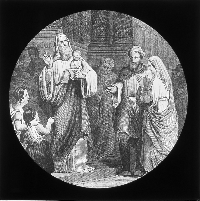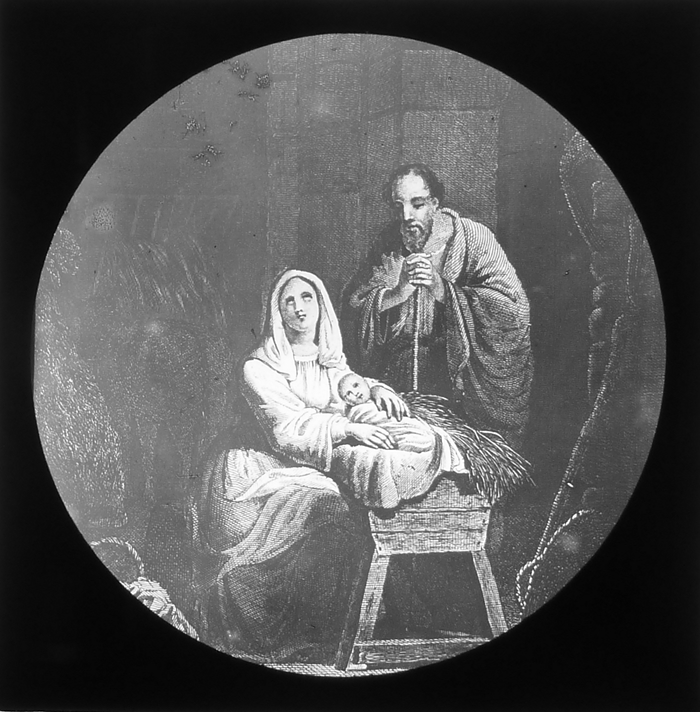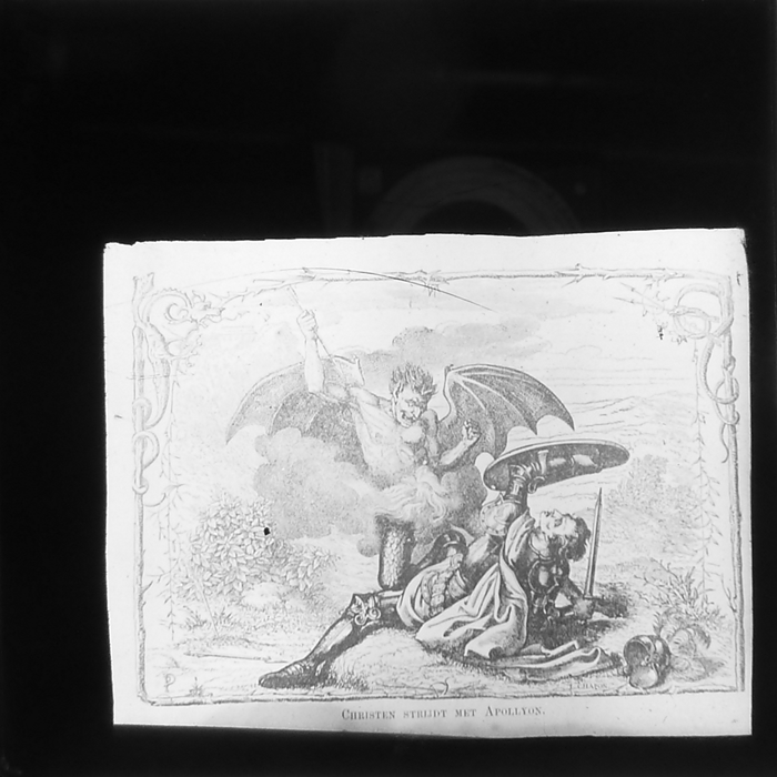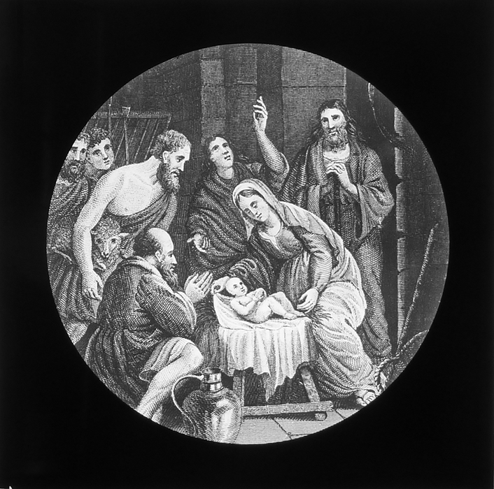 Vijftig lantaarnplaatjes met bijbelse voorstellingen in houten doos