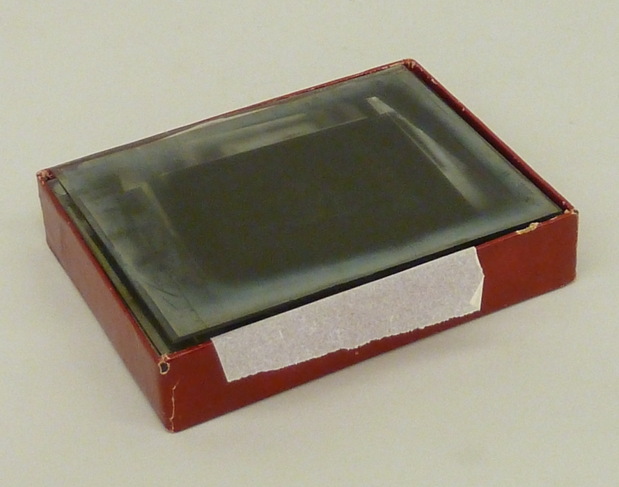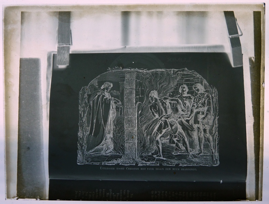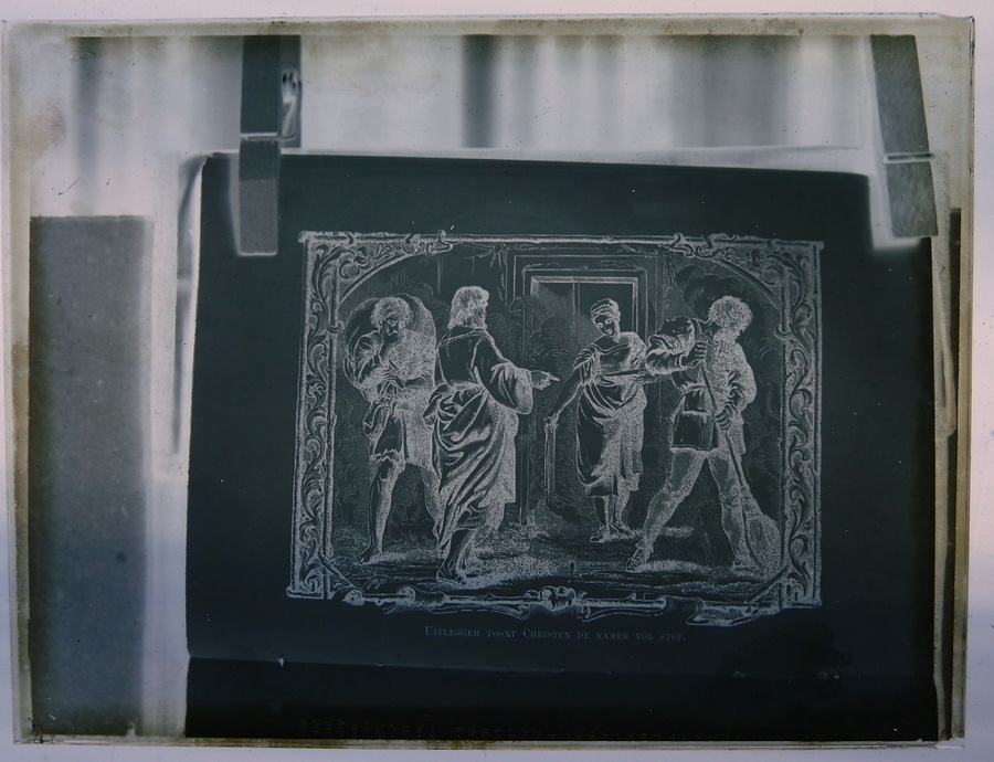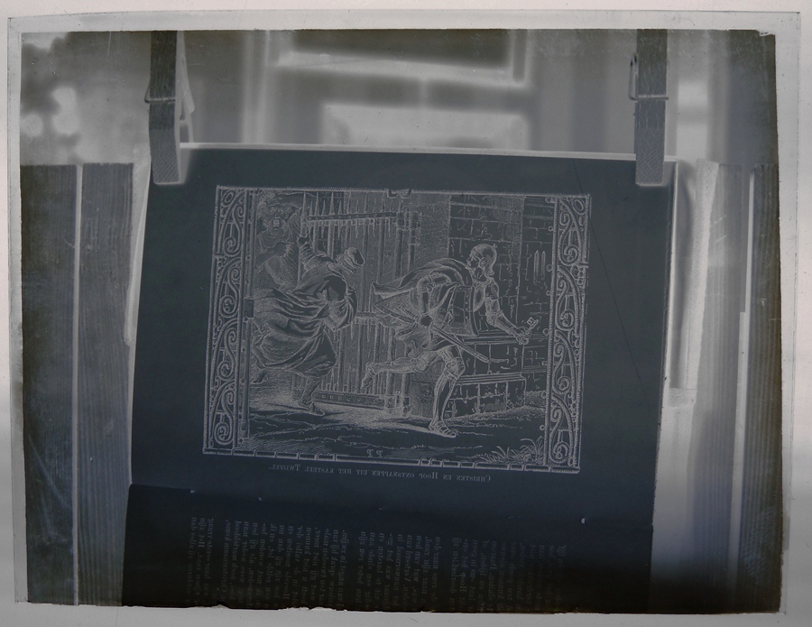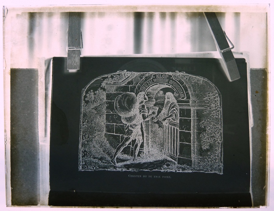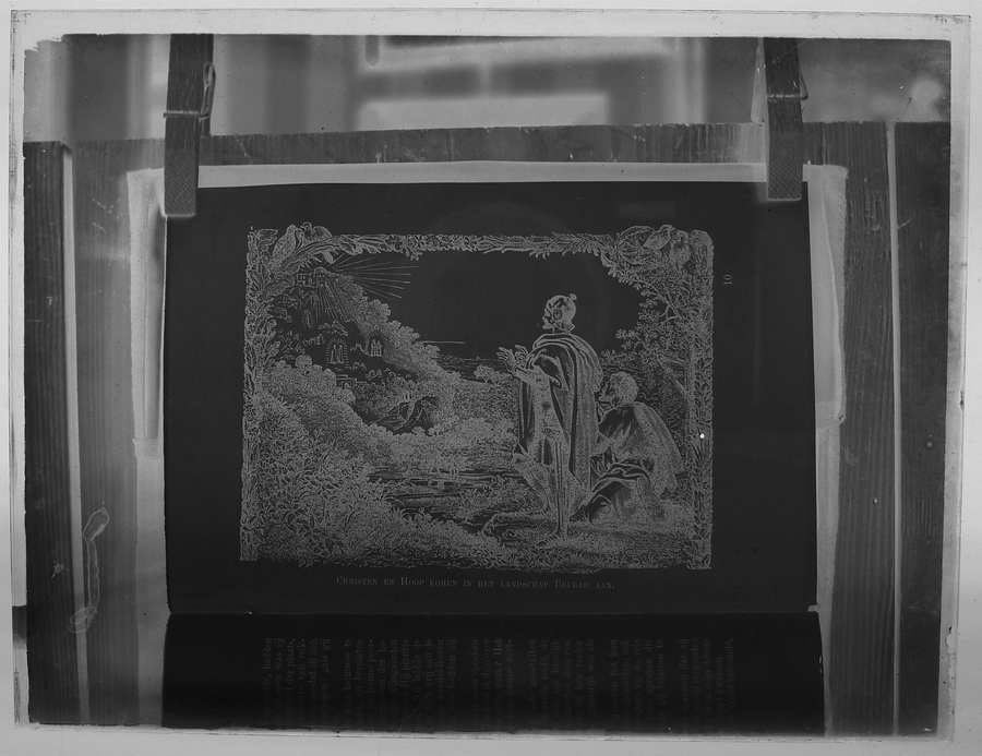 Rood doosje met 14 lantaarnplaatjes van "Bunyans pelgrimsreis", fotografieën uit een boek