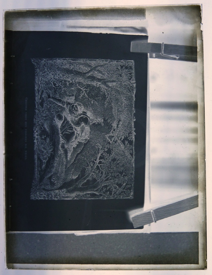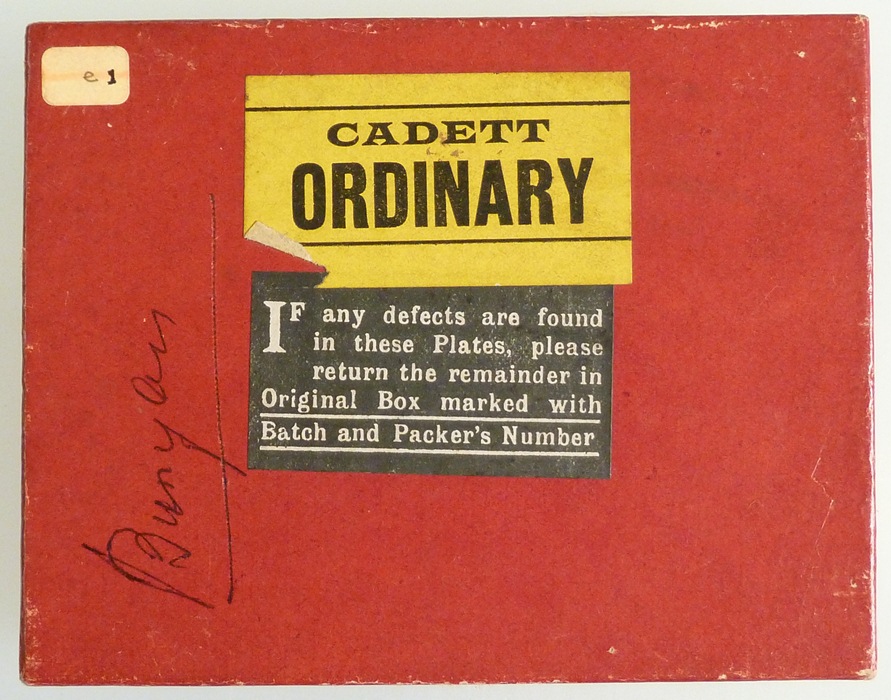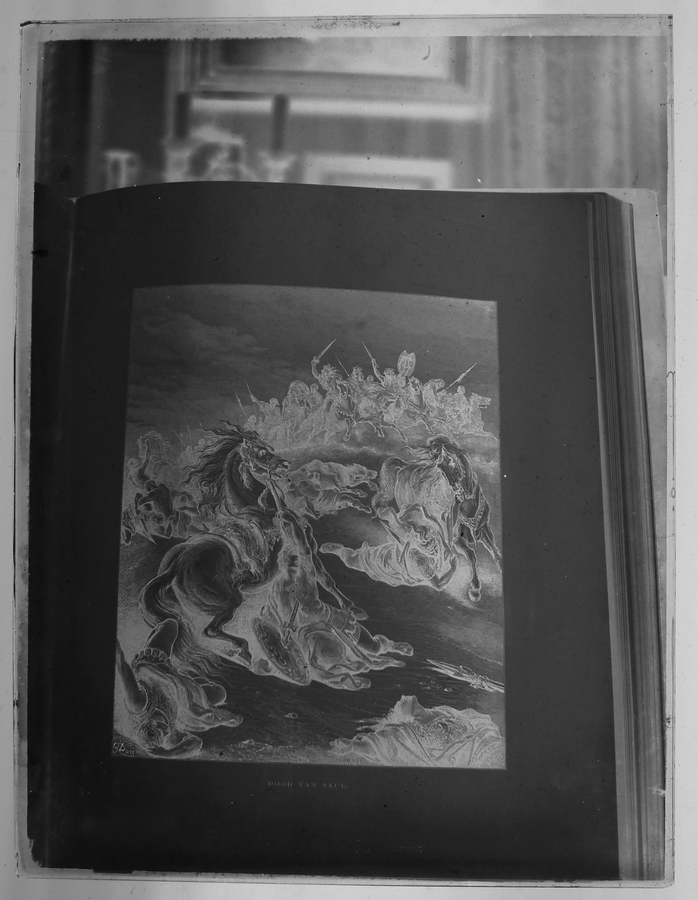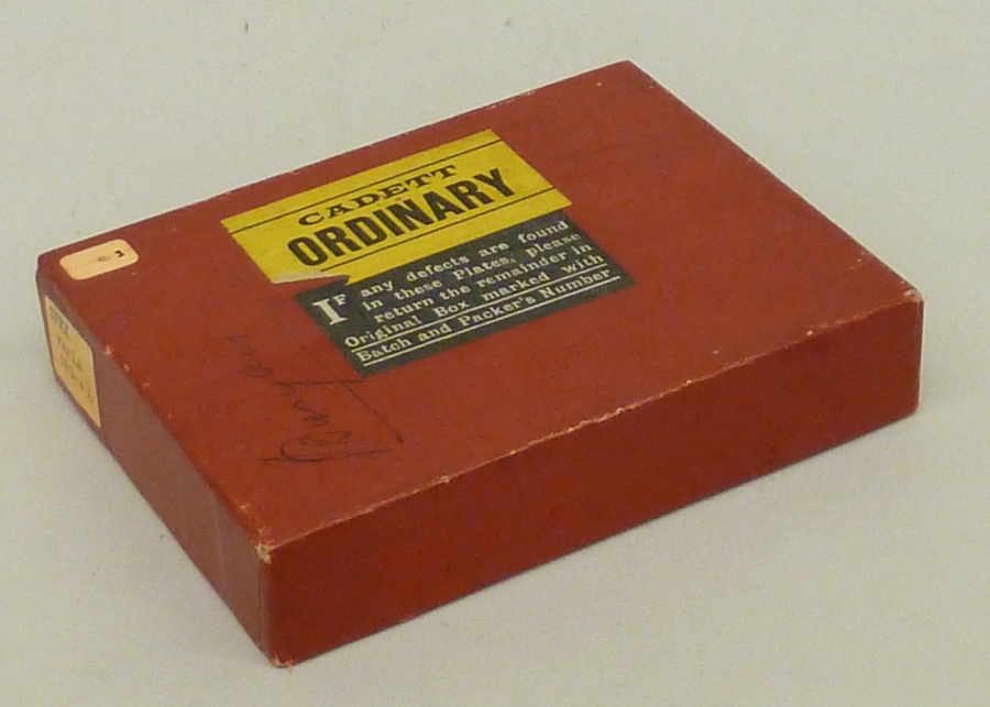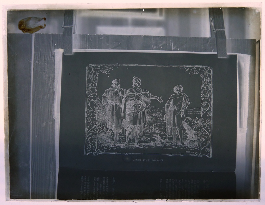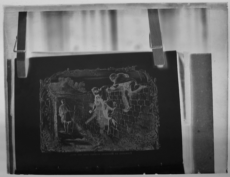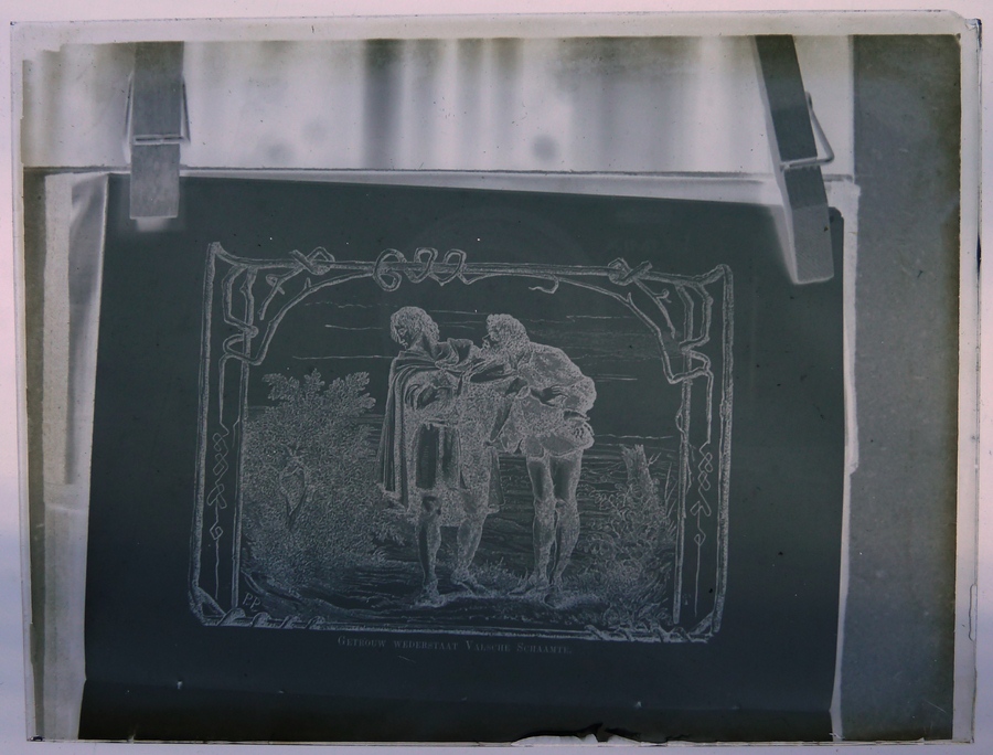 Rood doosje met 14 lantaarnplaatjes van "Bunyans pelgrimsreis", fotografieën uit een boek