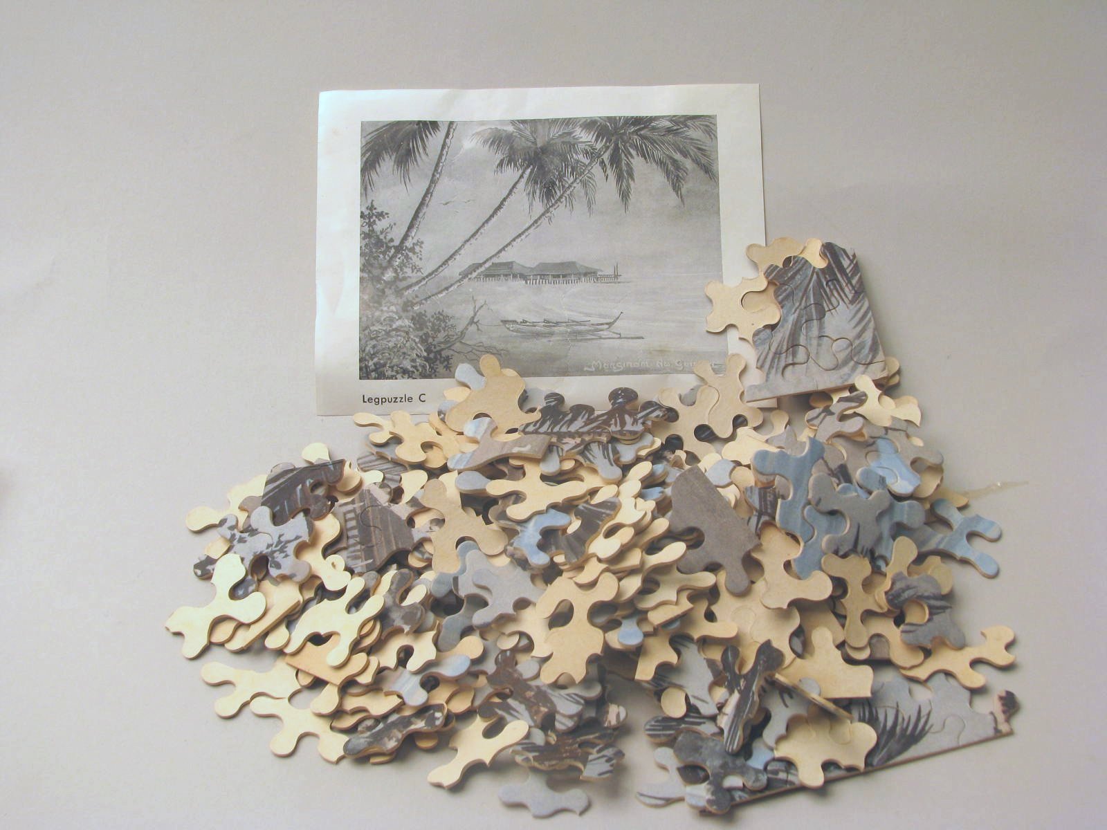 Pedagogisch materiaal van het Zendingsbureau Oegstgeest: puzzel met strand, bootje en gebouwen