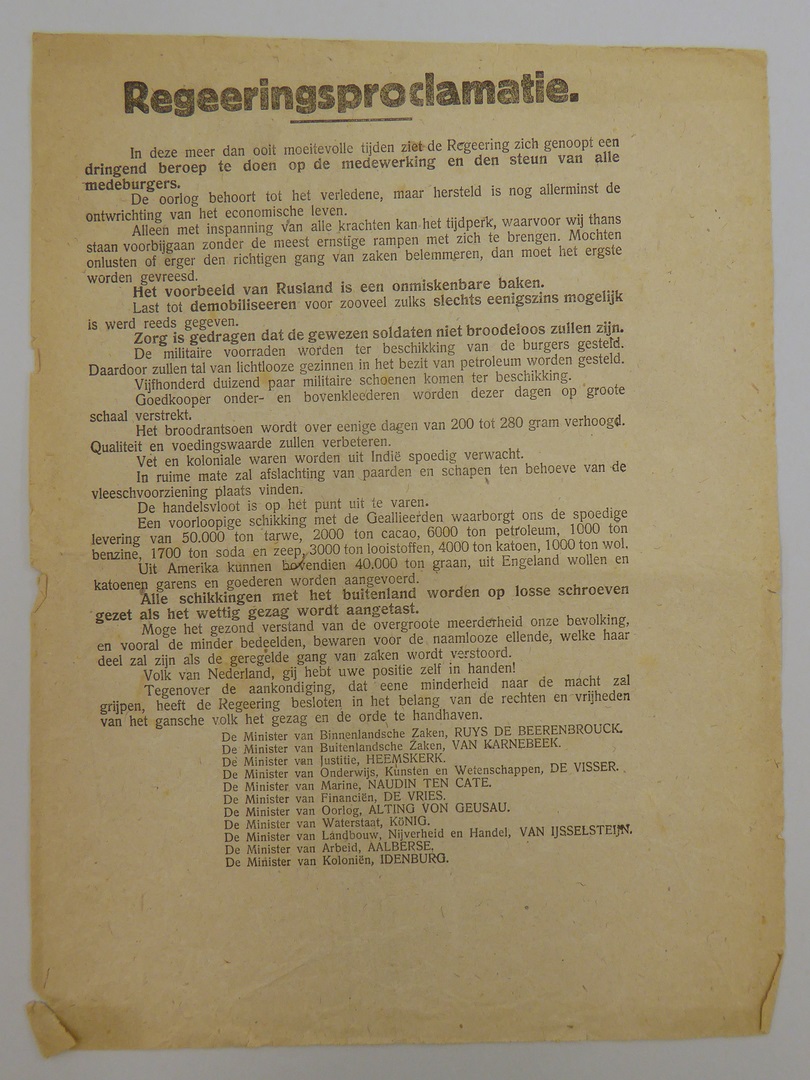 Strooiblad n.a.v. woelingen van 1918 rond Troelstra, SDAP en de 'moderne vakbeweging': Regeeringsproclamatie. ...