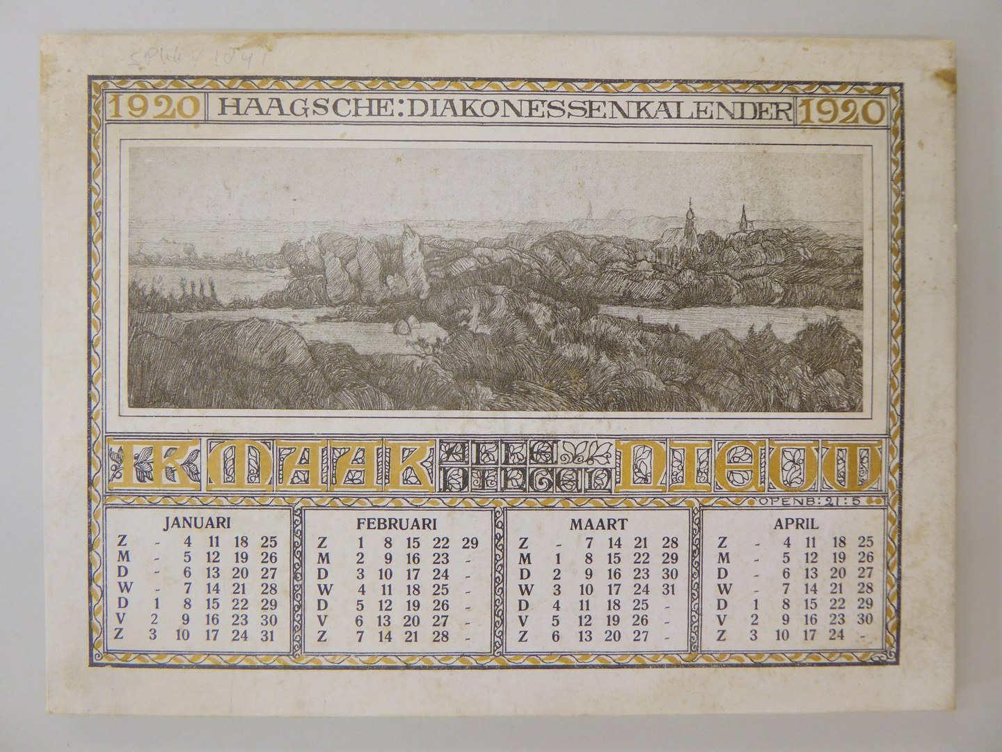 Haagsche Diakonessenkalender met een spreuk en landschapsgezichten