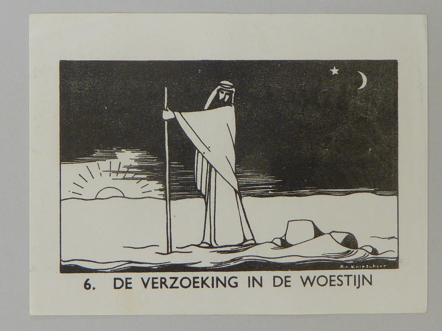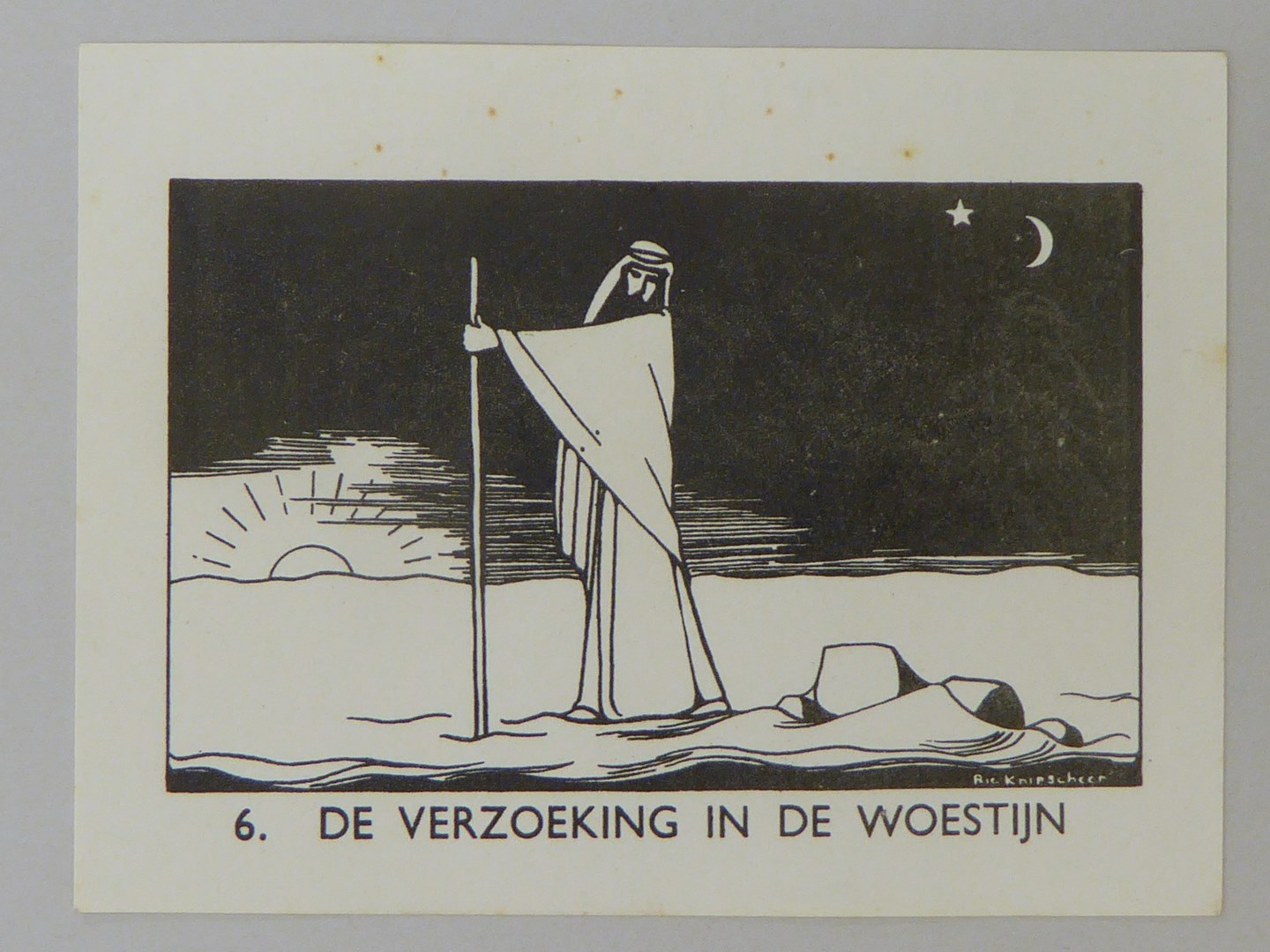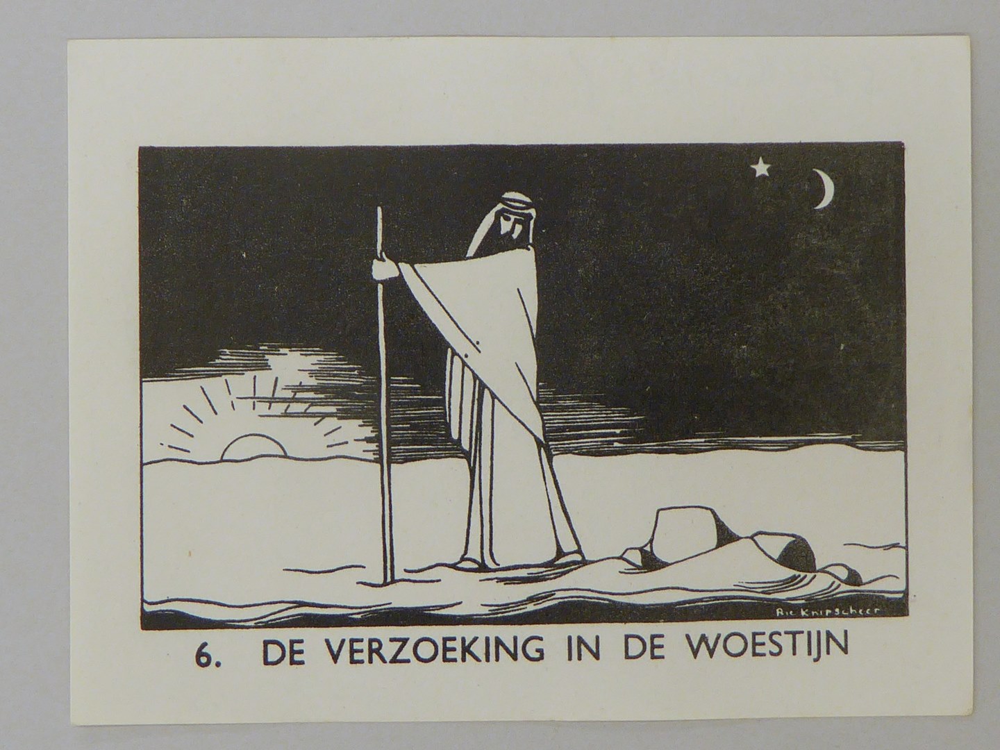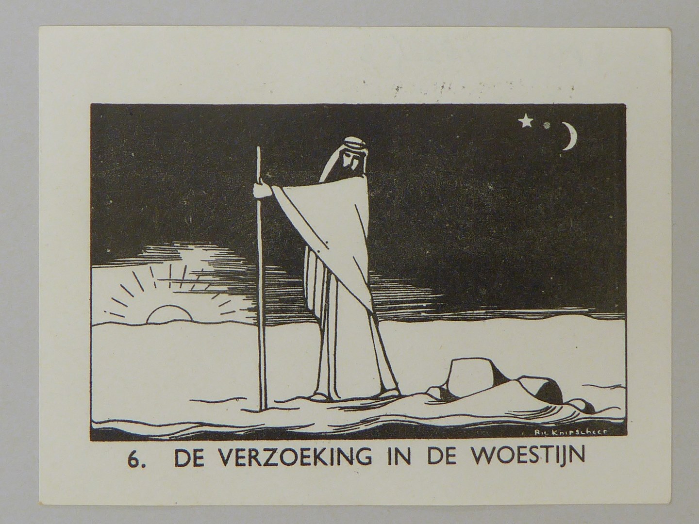 Bijbelplaatje met tekst: No. 6 De verzoeking in de woestijn (5 stuks)
