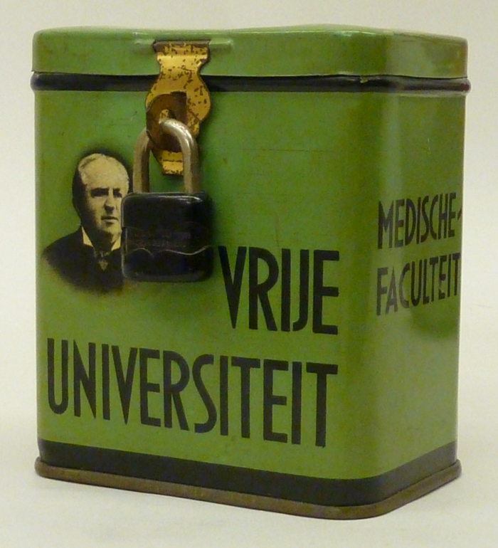 Groen VU-busje met "Vrije Universiteit" en "Medische Faculteit" en portret Kuyper, groen met slotje