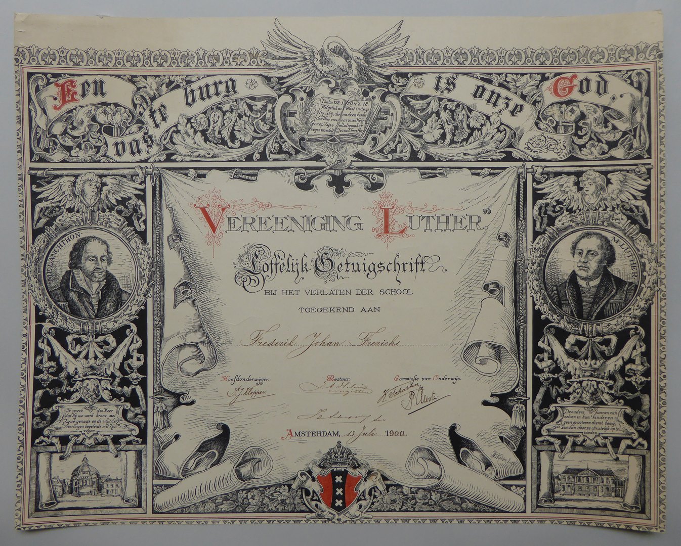 Getuigschrift van Vereeniging Luther te Amsterdam bij verlaten der school van F.J. Frerichs