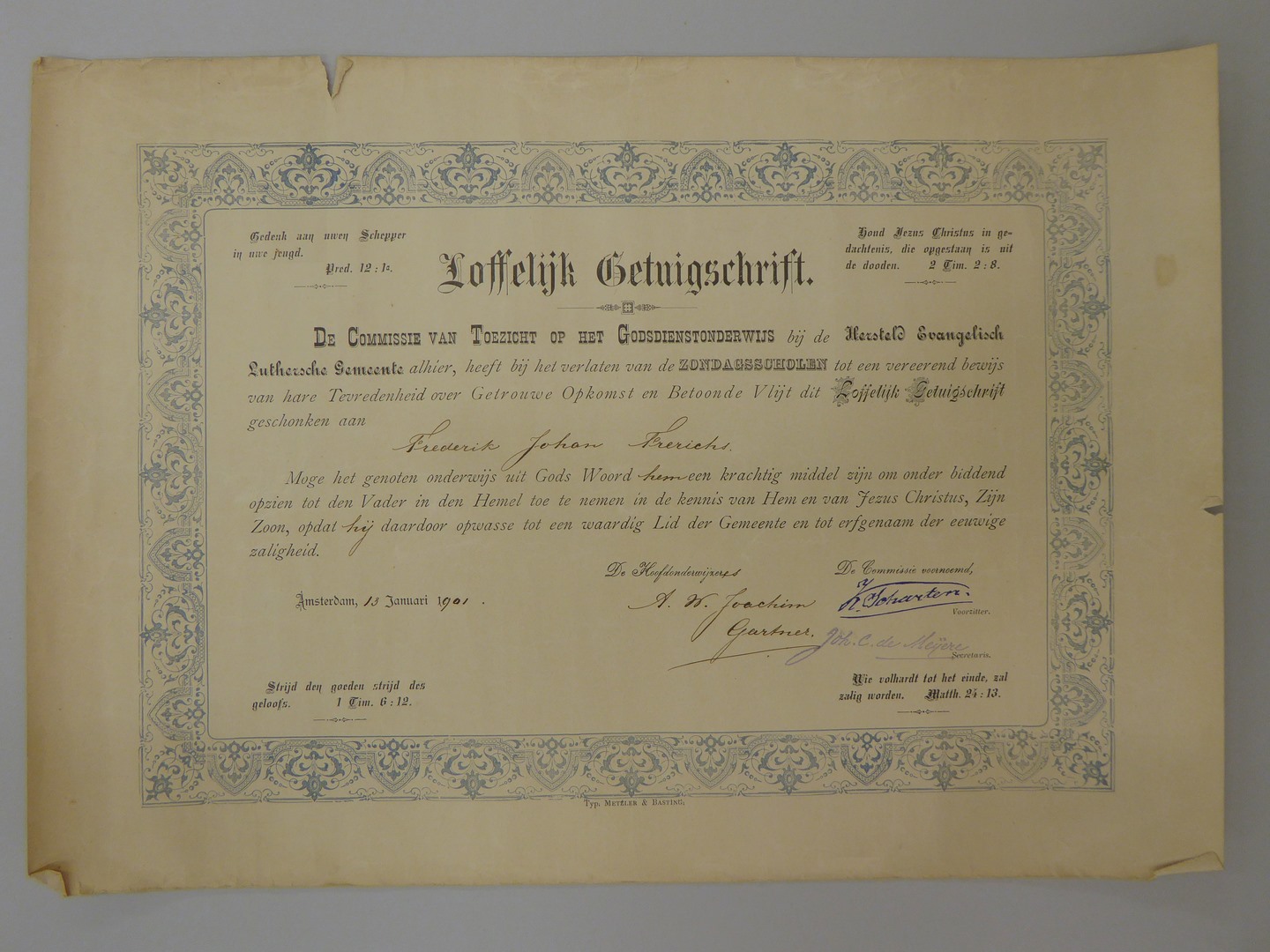 Getuigschrift voor zondagsschool van Commissie van Toezicht enz., uitgereikt aan Frederik Johan Frerichs