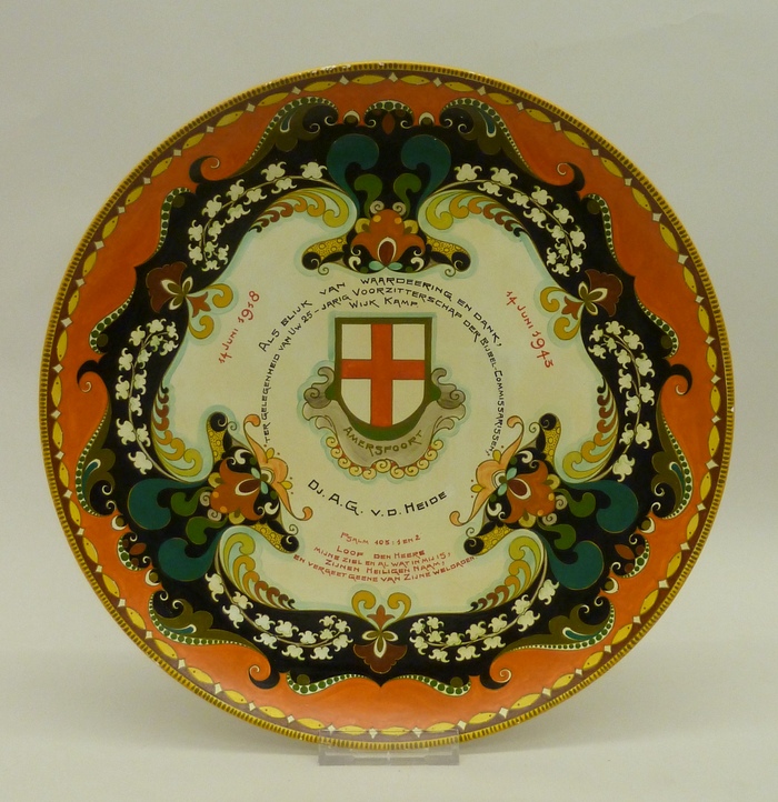 Objecten aangaande Djuurd Anne Geertruid van der Heide (1879-1976): bord met "Als blijk van waardering en dank, ter gelegenheid van uw 25-jarig voorzitterschap van de bijbel-commissarissen ..."