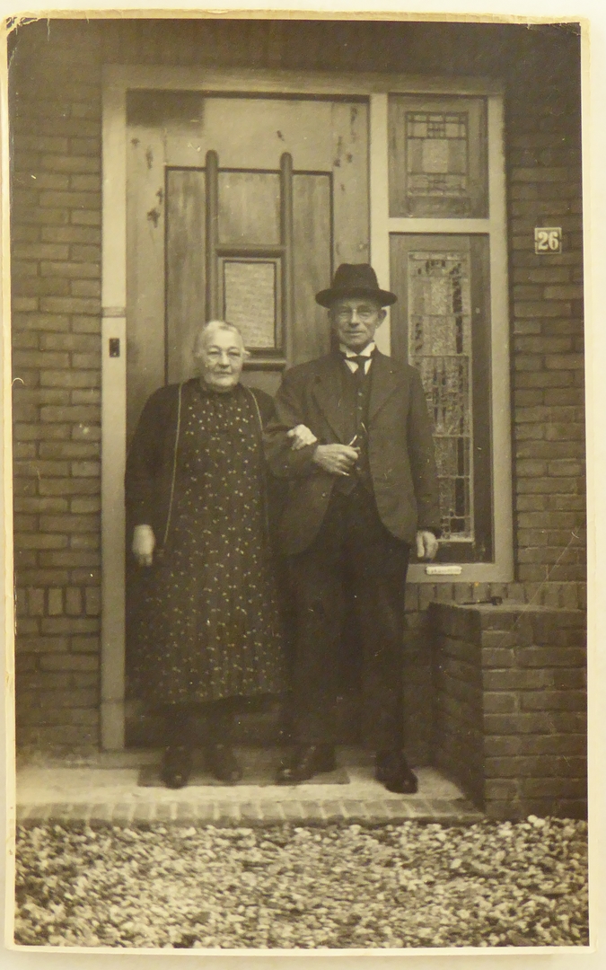 Objecten aangaande Djuurd Anne Geertruid van der Heide (1879-1976): foto waarop echtpaar van der Heide voor huisdeur