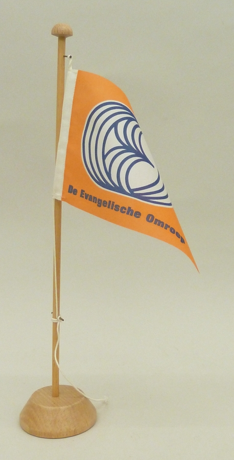 Oranje vlaggetje met embleem van de Evangelische Omroep, op standaard
