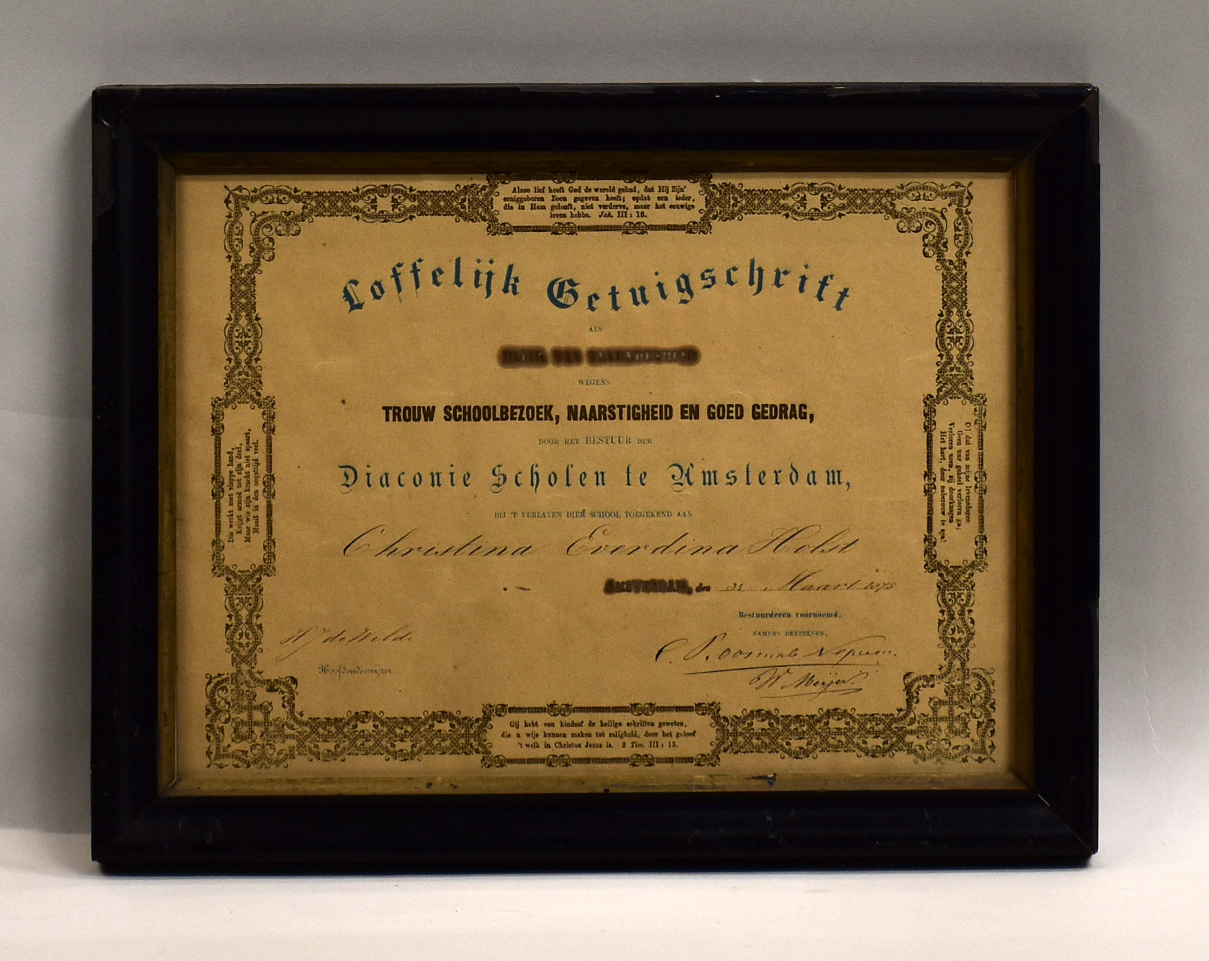 Loffelijk getuigschrift wegens trouw schoolbezoek enz. door bestuur Diaconie Scholen te Amsterdam