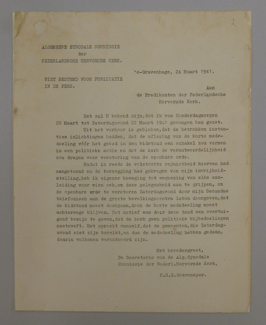 Schrijven van synodale commissie aan predikanten betreffende beschuldiging politieke aktie