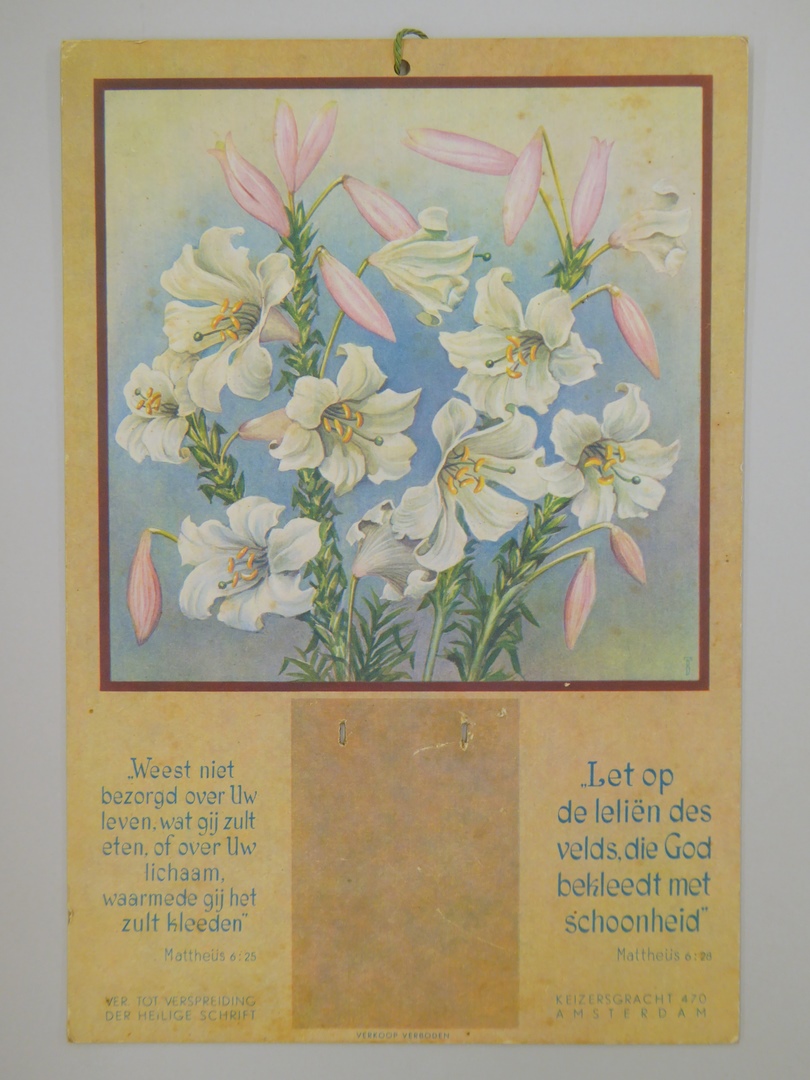 Kalenderschild met lelies en bijbelteksten