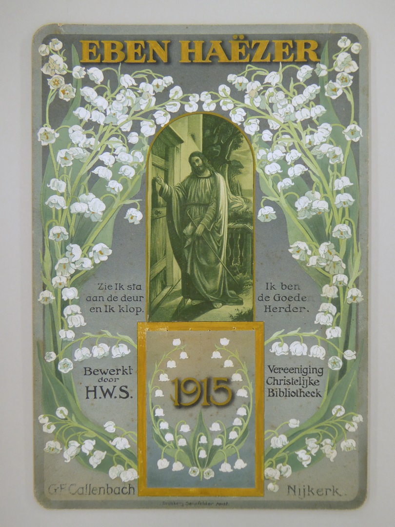Kalenderschild Eben Haëzer met Christus omkranst door lelietjes van dalen
