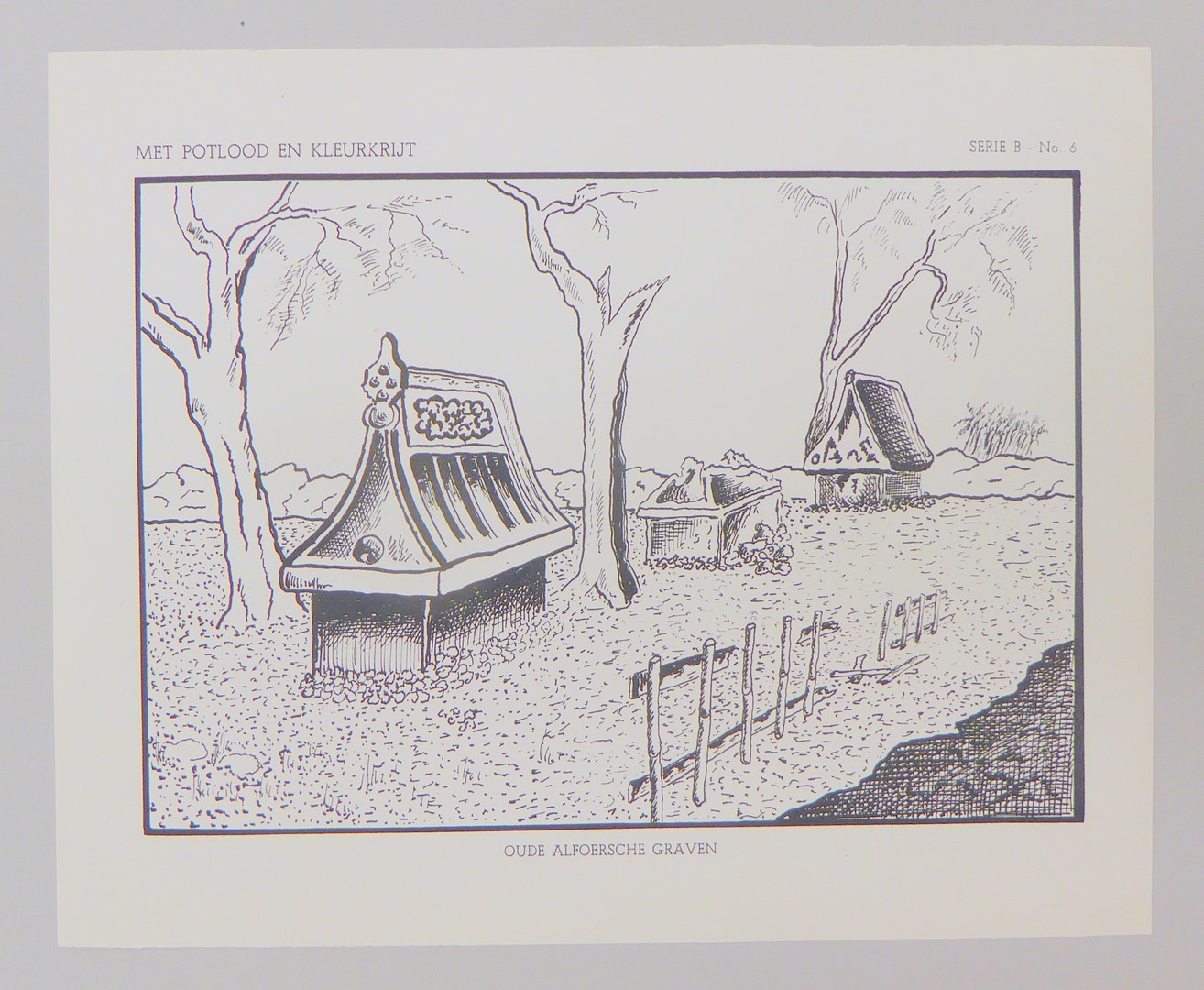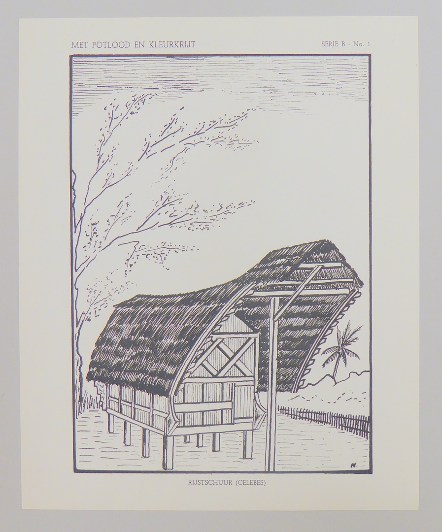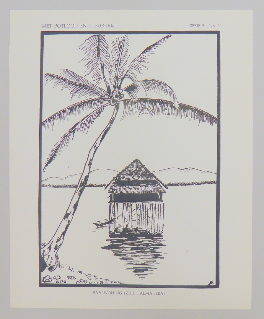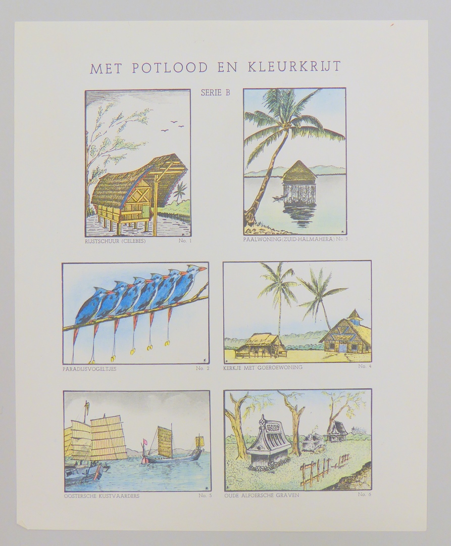 Serie kleurplaten (7 stuks) met "Met potlood en kleurkrijt" voor platenatlas, serie B