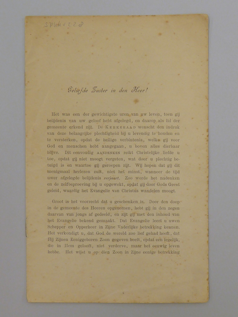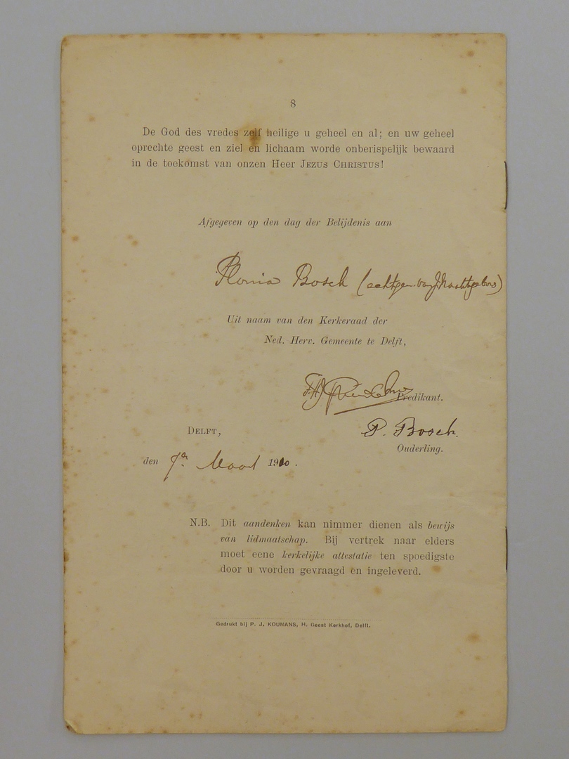 Aandenken aan de belijdenis van Plonia Bosch van de Ned. Herv. gemeente te Delft