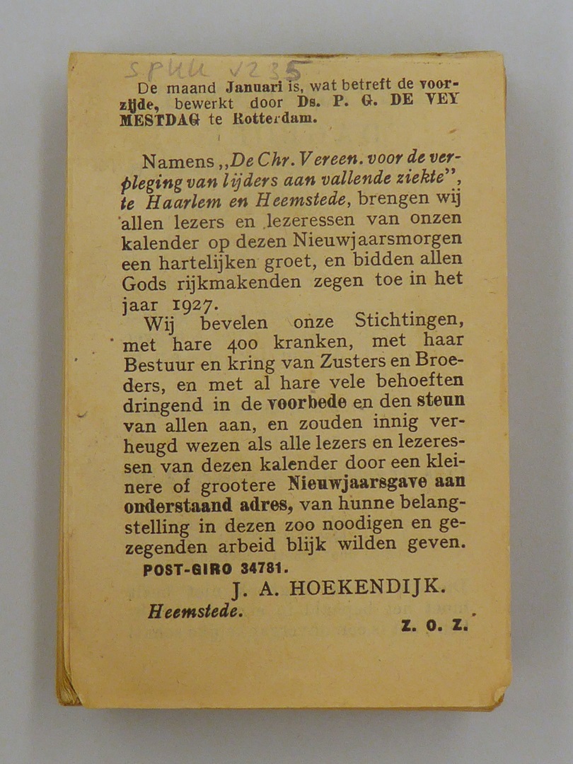 Kalender van de "Chr. Vereen. voor de verpleging van lijders aan vallende ziekte"