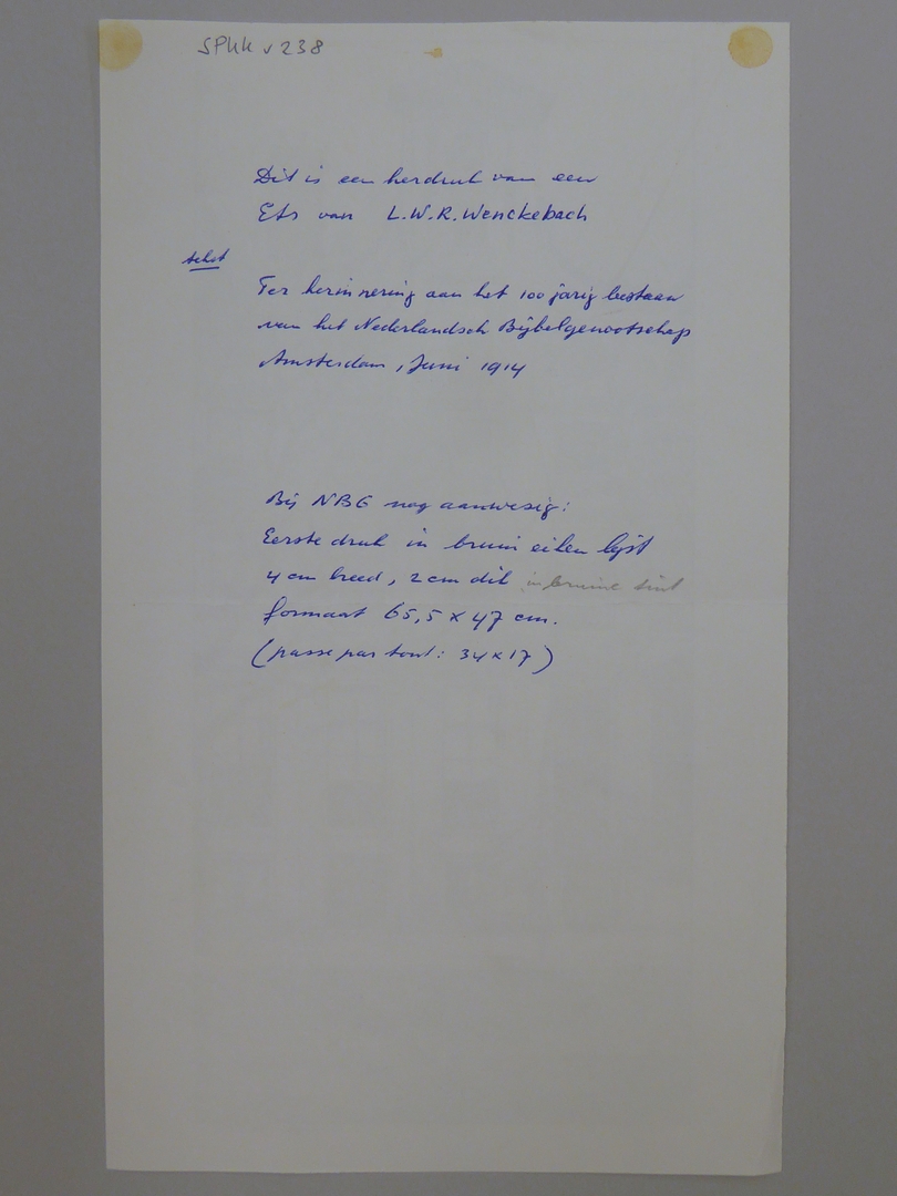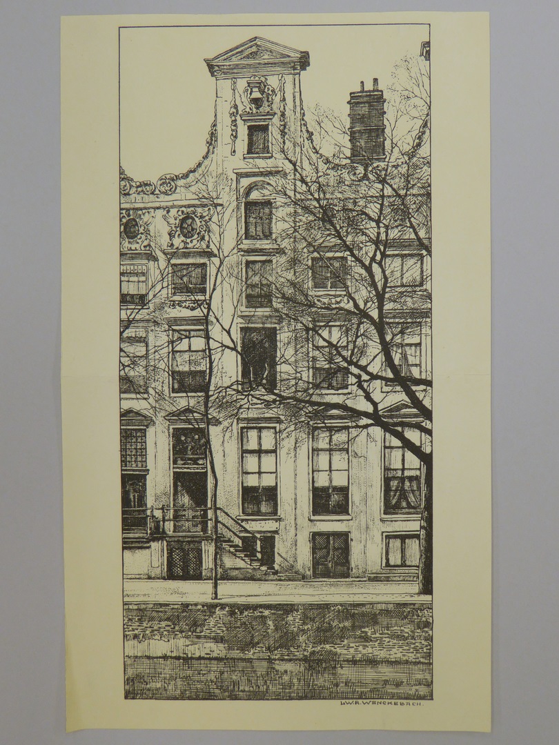 Herdruk van ets met pand Herengracht 366 te Amsterdam, ter herinnering 100-jarig bestaan Bijbelgenootschap