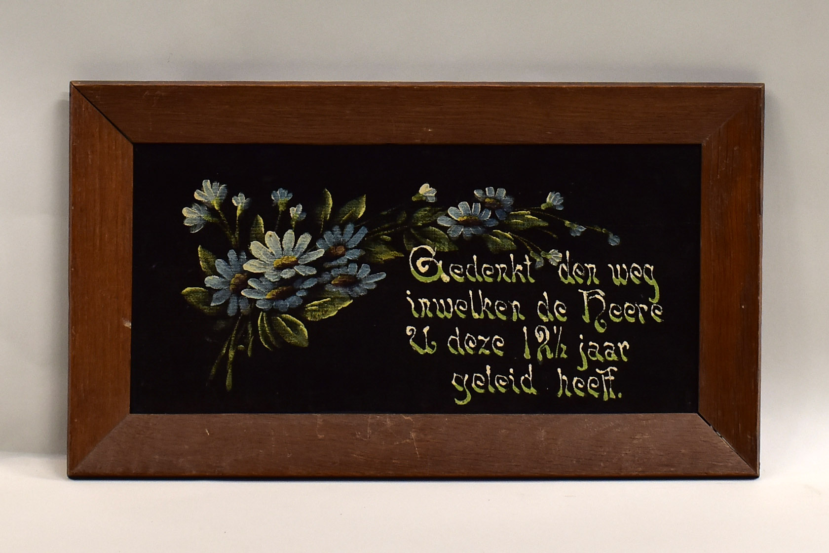 Wandbord met "Gedenkt den weg inwelken de Heer U deze 12.5 jaar geleid heeft"