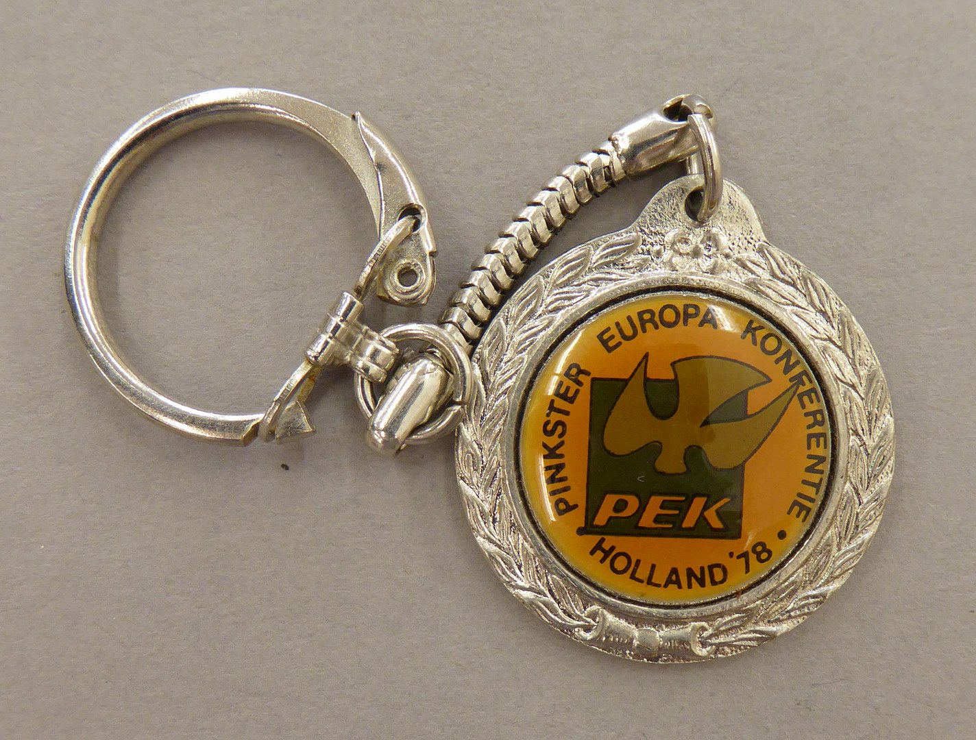 Sleutelhanger met duif en "Pinkster Europa Konferentie, Holland '78, PEK"