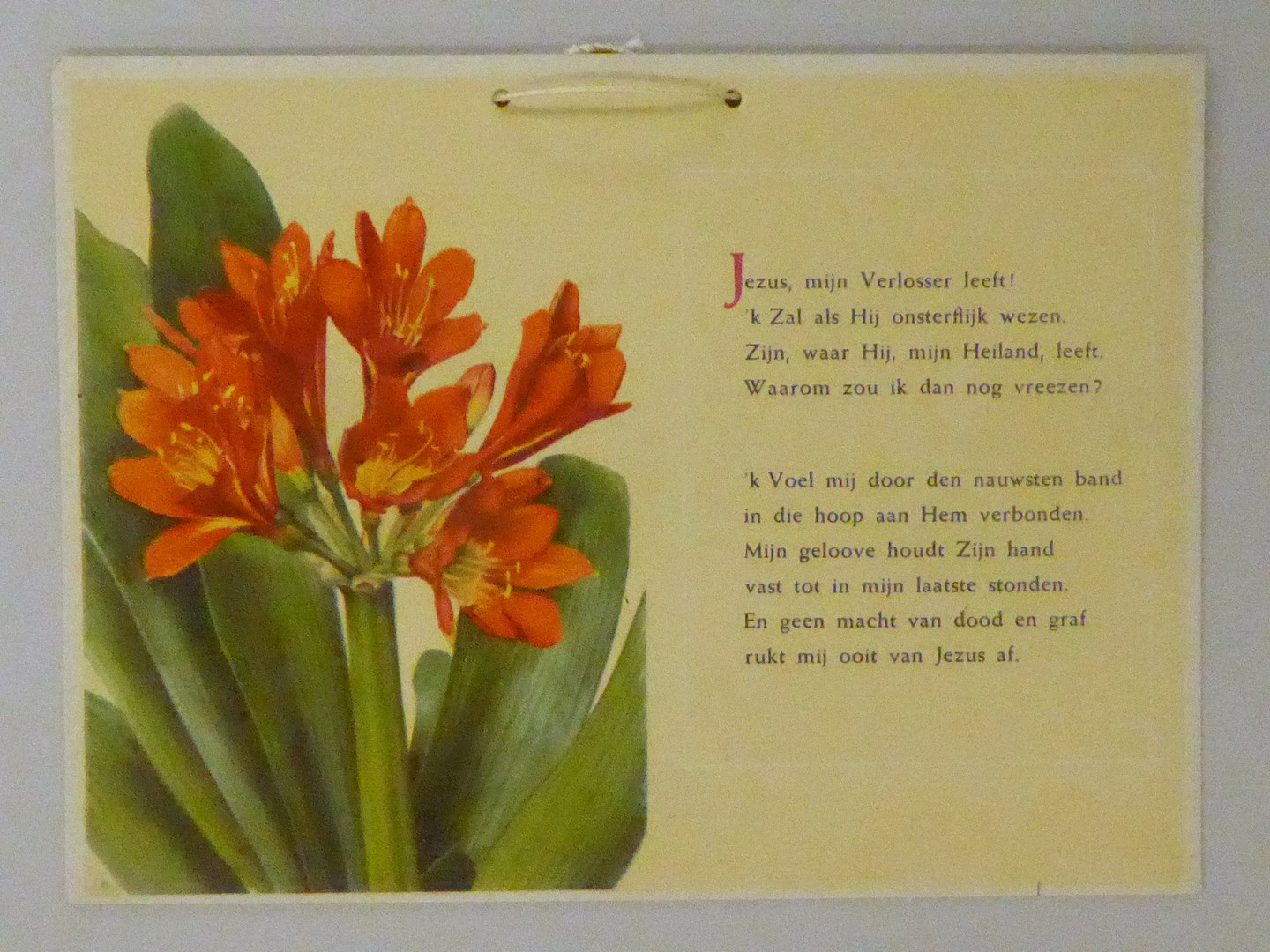 Tekstbord met "Jezus, mijn Verlosser leeft! ..." en bloem