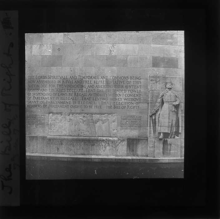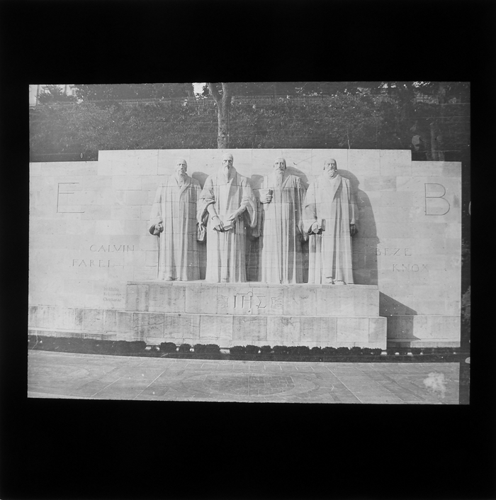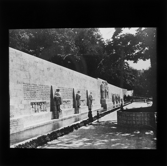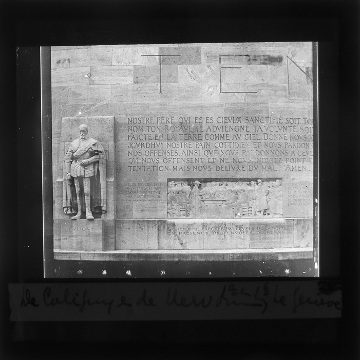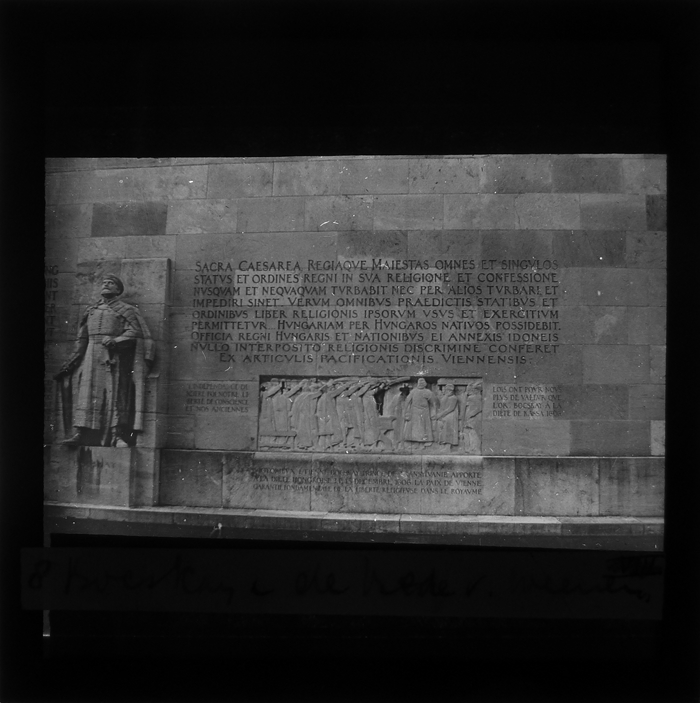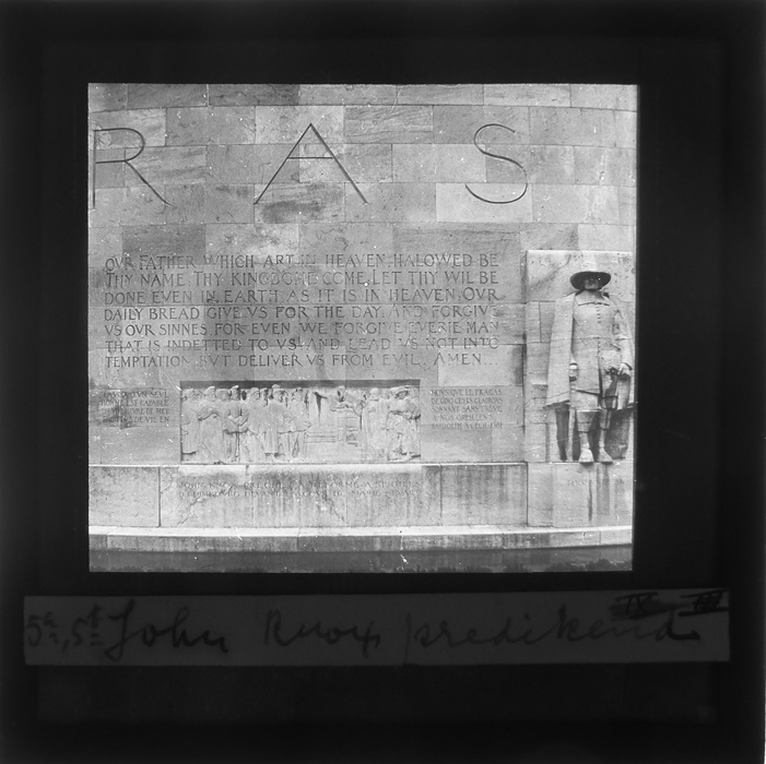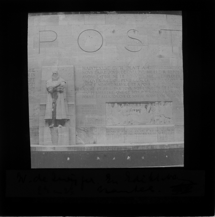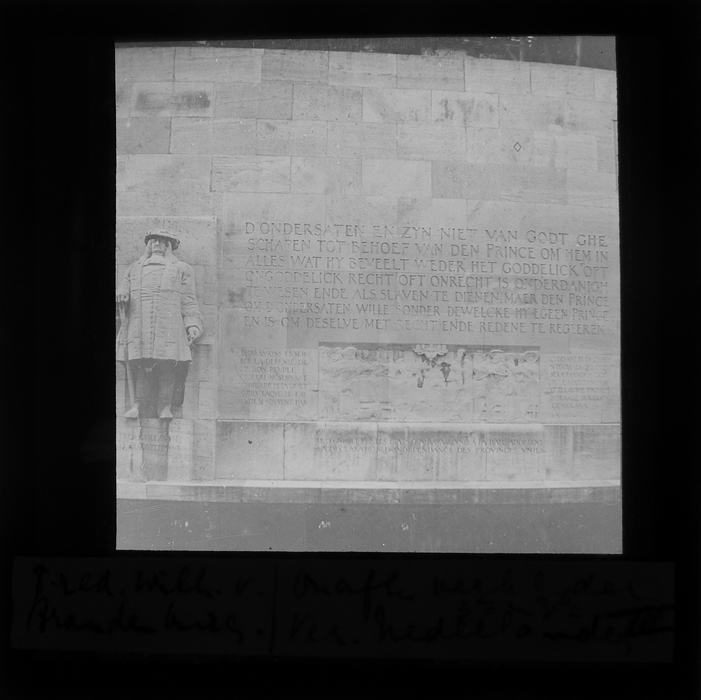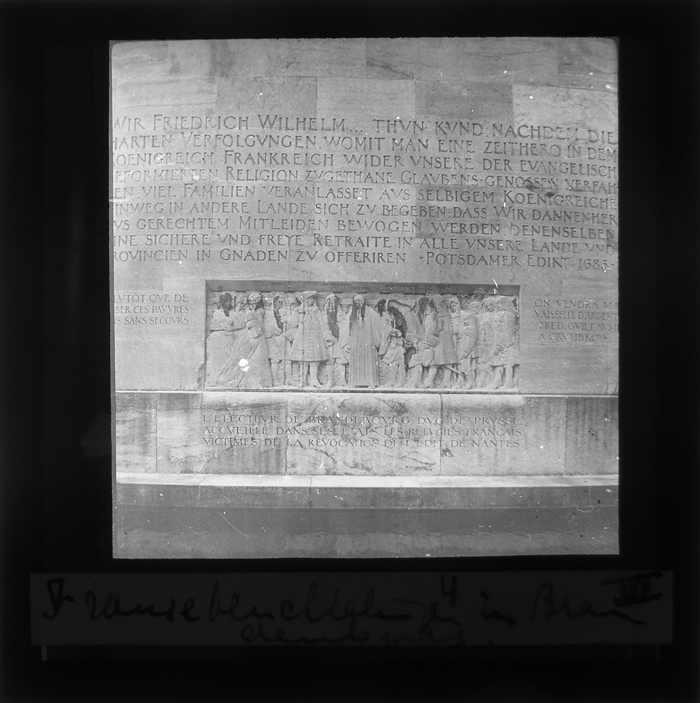 Serie van 10 lantaarnplaatjes van een monument met teksten in vijf talen