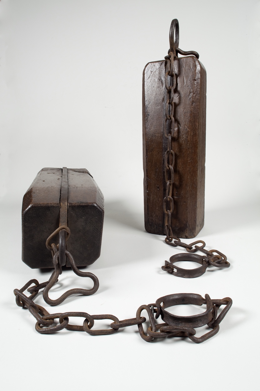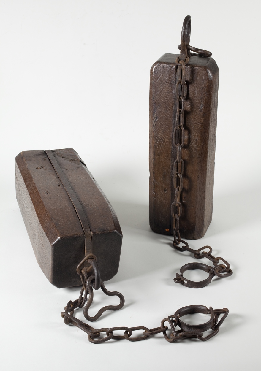 Beenblok met ijzeren band waaraan ketting met enkelband, afkomstig uit het Doopsgezind weeshuis in Koog aan de Zaan