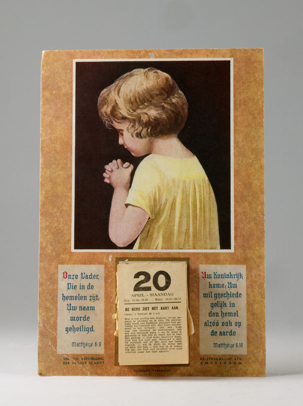 Scheurkalender op kalenderschild met biddend meisje en "Onze Vader, Die in de hemelen zijt ..."