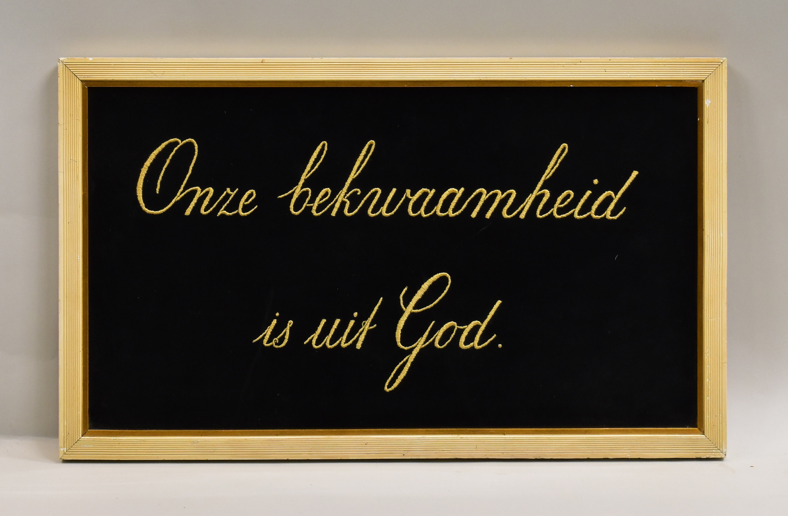 Wandbord geborduurd met "Onze bekwaamheid is uit God" in goud