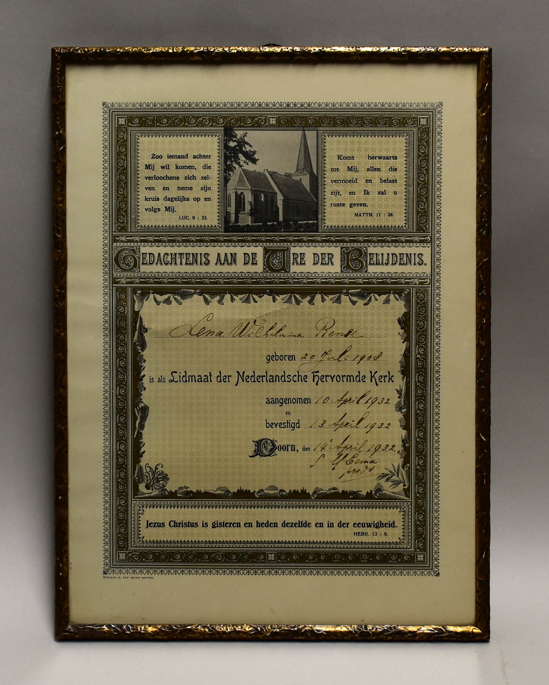 Gedachtenis aan de belijdenis van Lena Wilhelmina Rense met "Zoo iemand achter Mij ..." en kerkgebouw
