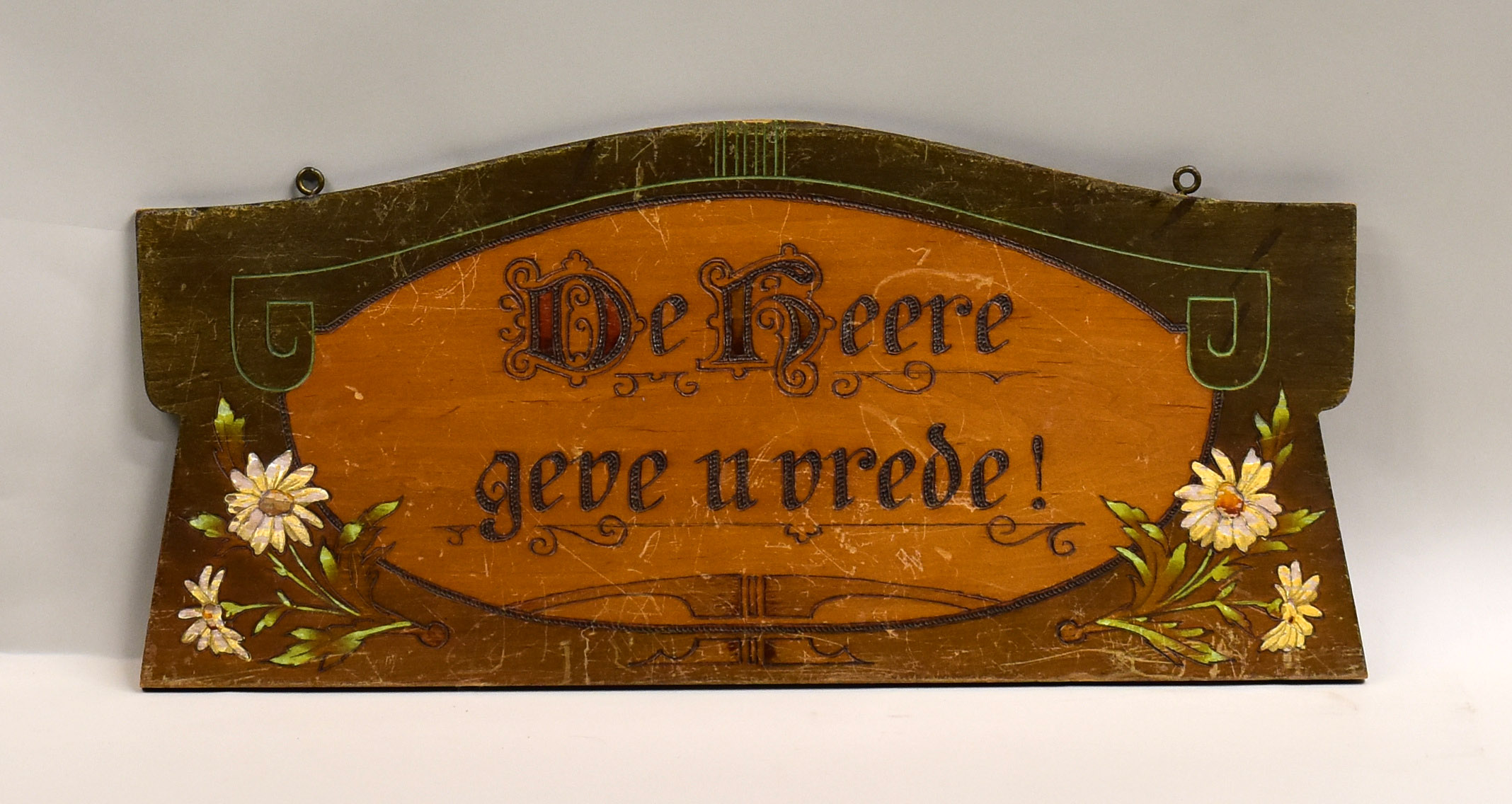 Wandbord met "De Heere geve u vrede!" en vier bloemen
