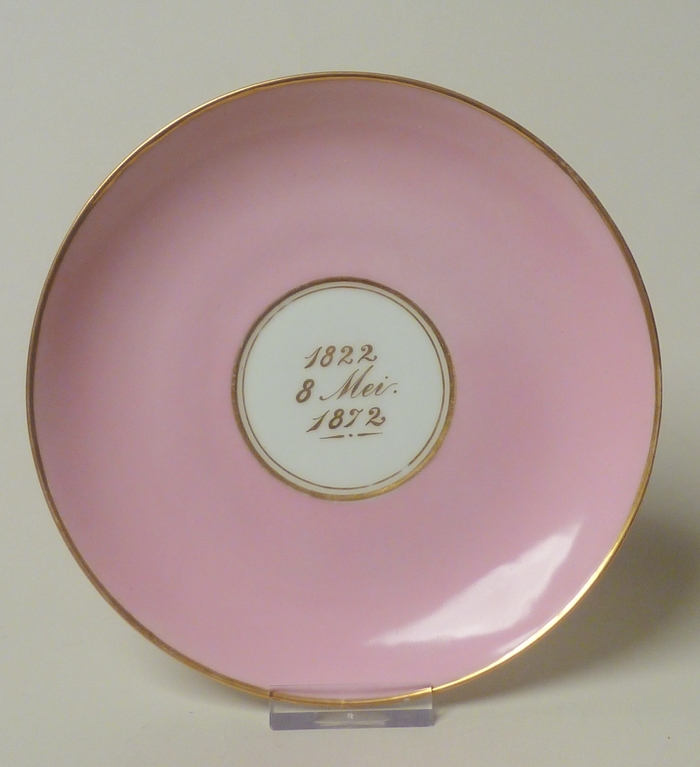 Roze schotel met witte cirkel waarin met gouden letters "1822 8 mei 1872", t.g.v. 50-jarig huwelijk