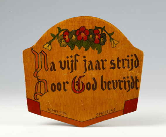 Tekstbord met "Na vijf jaar strijd door God bevrijdt 10 mei 1940 5 mei 1945"