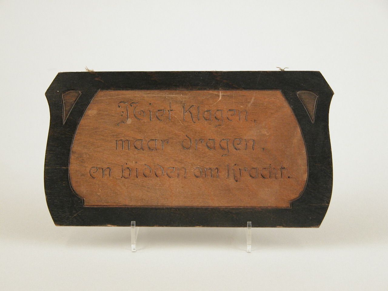 Tekstbord met "Niet klagen, maar dragen, en bidden om kracht."