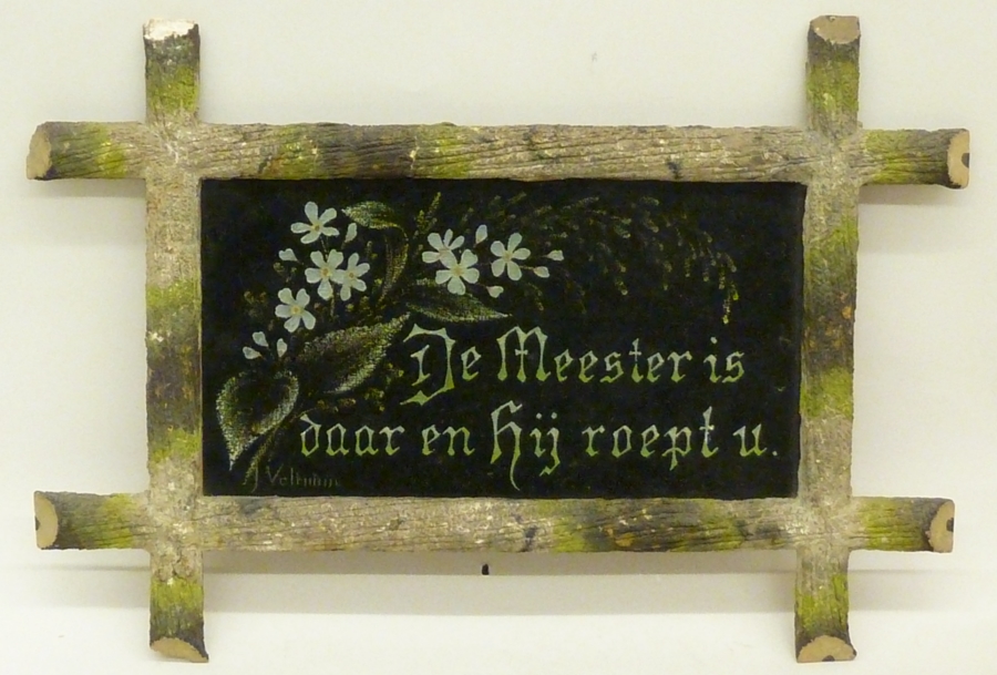 Tekstbord met geschilderde bloemen en met "De Meester is daar en Hij roept u". Op achterzijde de tekst: "Jan Christoffel Uhlenbroek. Ter herinnering aan zijn afgelegde geloofsbelijdenis op 15 Maart 1904 van zijn innig liefhebbende Susanna"
