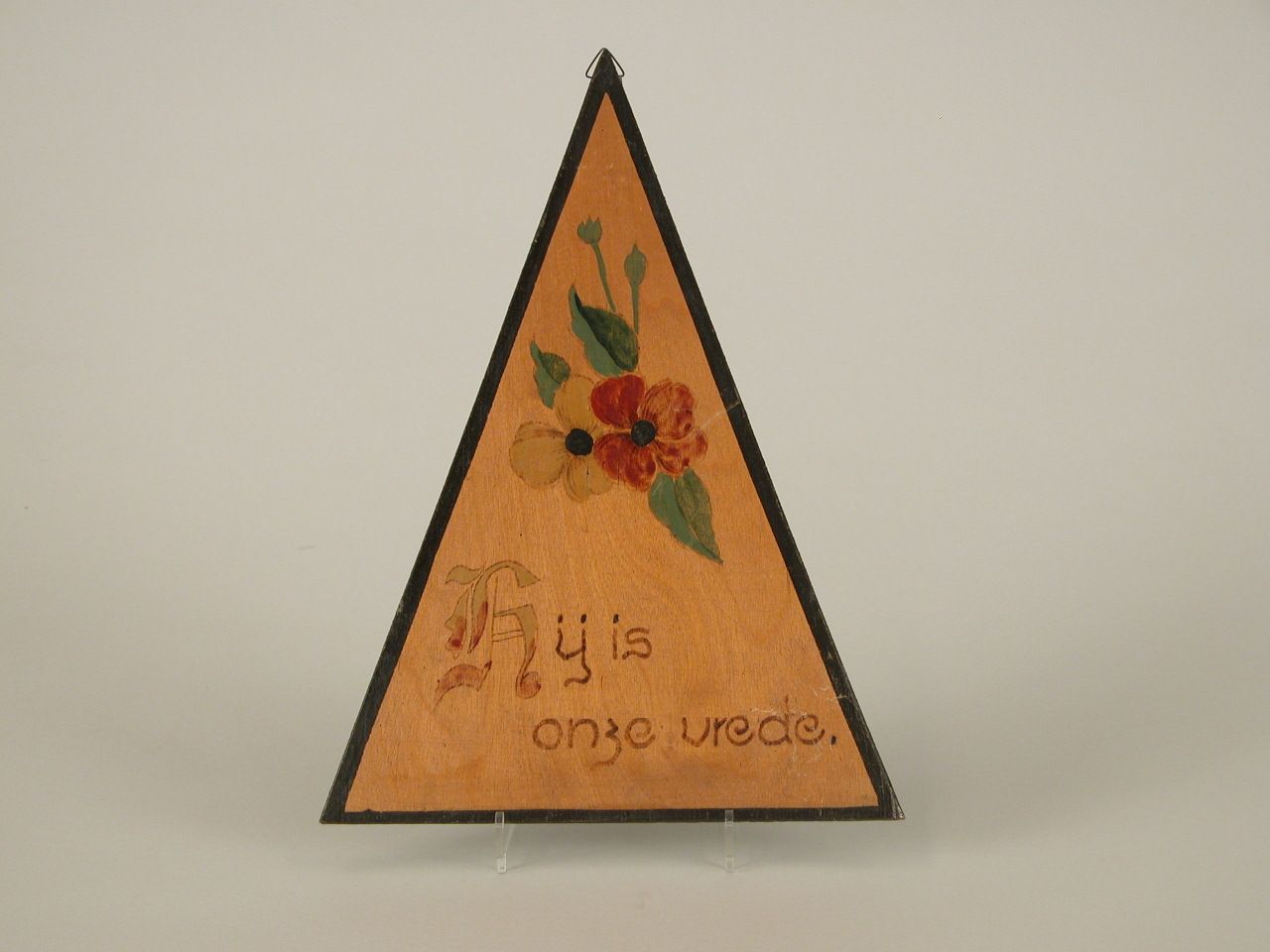 Driehoekig tekstbord met "Hij is onze vrede."