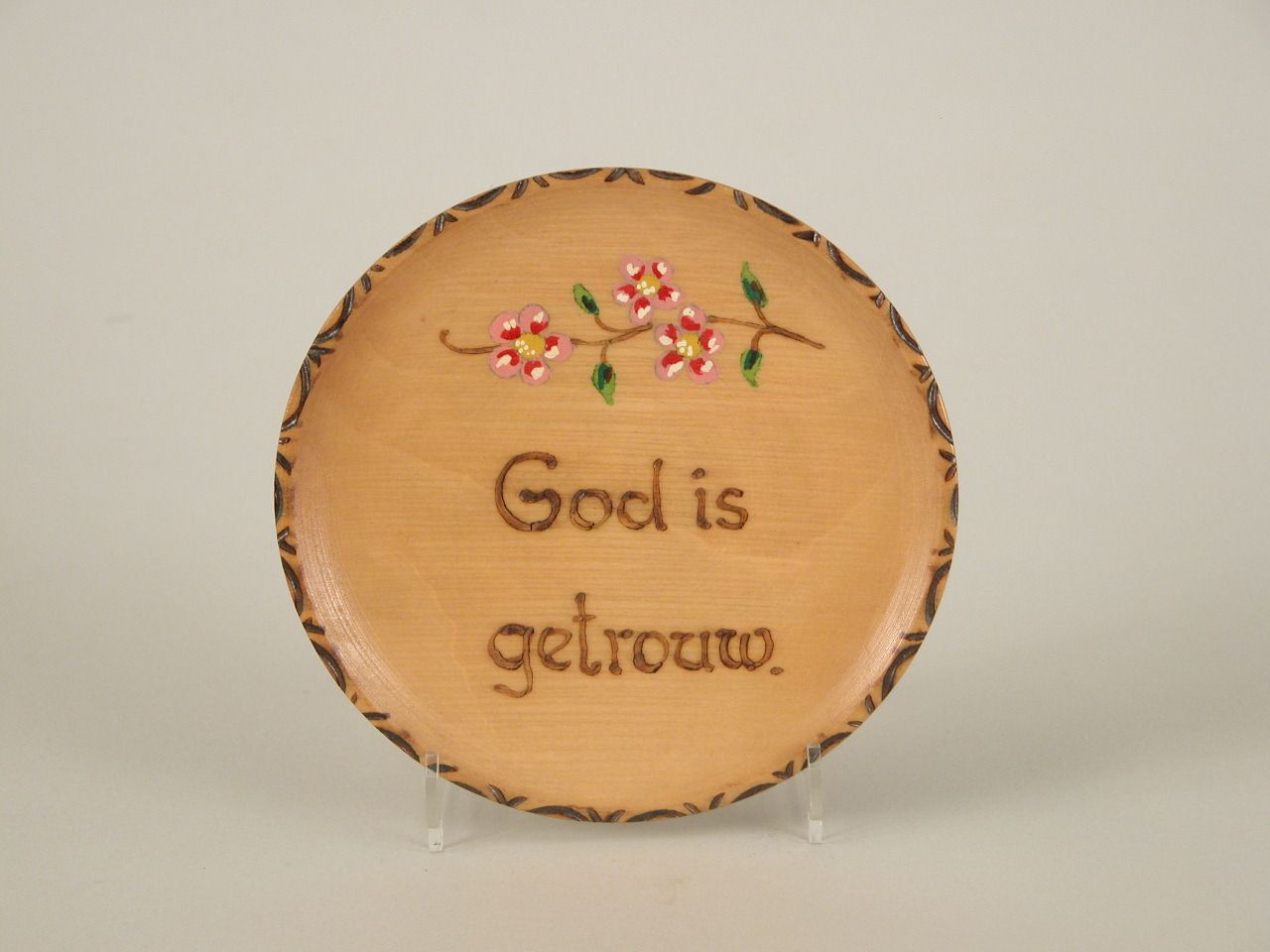Rond tekstbord met "God is getrouw."