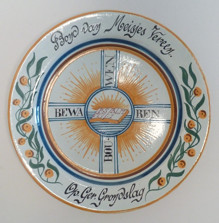 Wandbord met "Bewaren bouwen" en met op rand "Bond van Meisjes Vereen. op Ger. Grondslag"