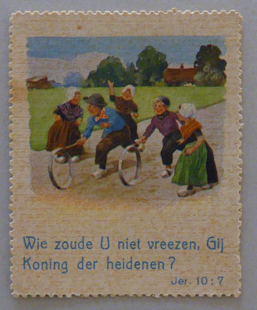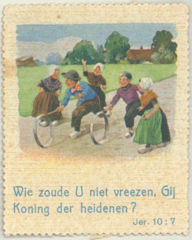 Beloningsplaatje met kinderen met hoepels en met "Wie zoude U niet vreezen, Gij Koning der heidenen? Jer. 10:7"