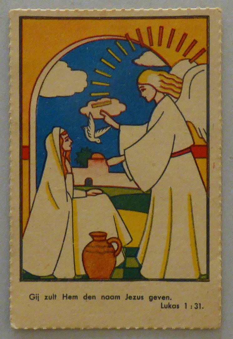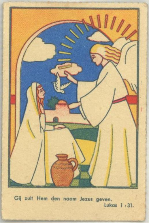 Beloningsplaatje met Maria en engel en met "Gij zult Hem de naam Jezus geven. Lukas 1:31"