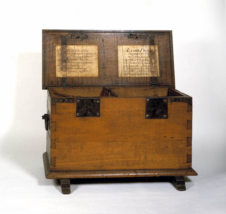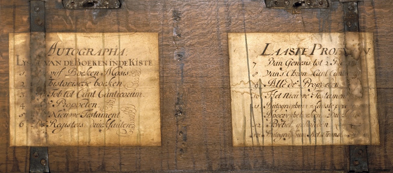 Kist met twee sleutels waar in autografen en drukproeven van Statenvertaling lagen