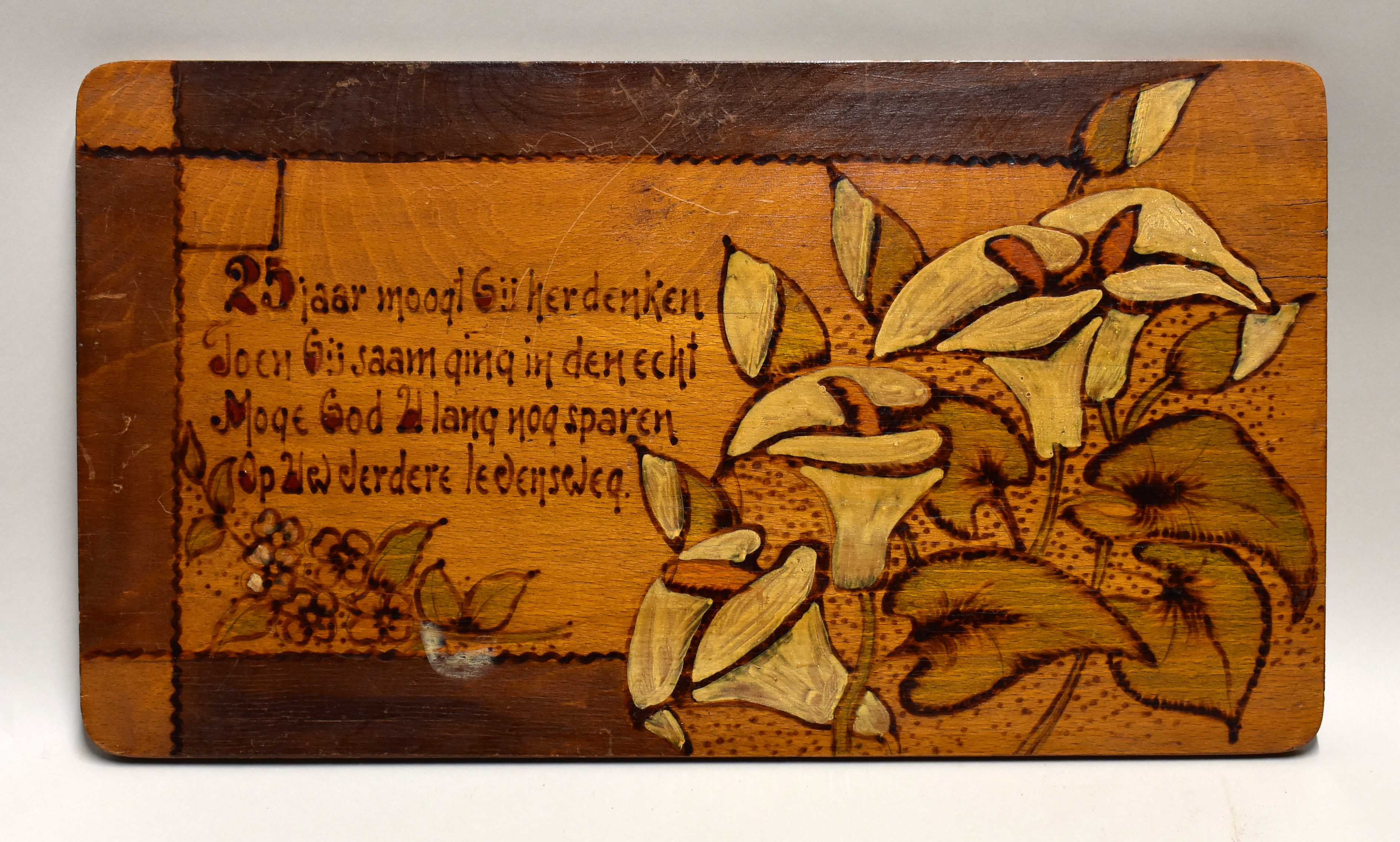 Wandbord met "25 Jaar moogt Gij herdenken/Toen Gij saam ging in den echt..."