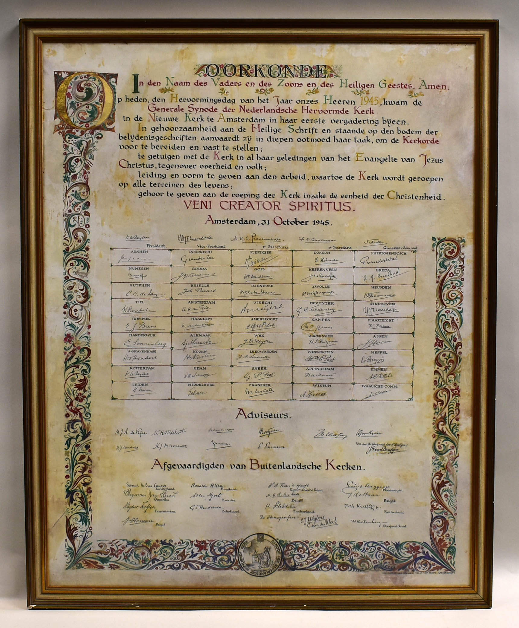 Ingelijste oorkonde t.g.v. bijeenkomen van Generale Synode Ned. Herv. kerk op 31 okt. 1945