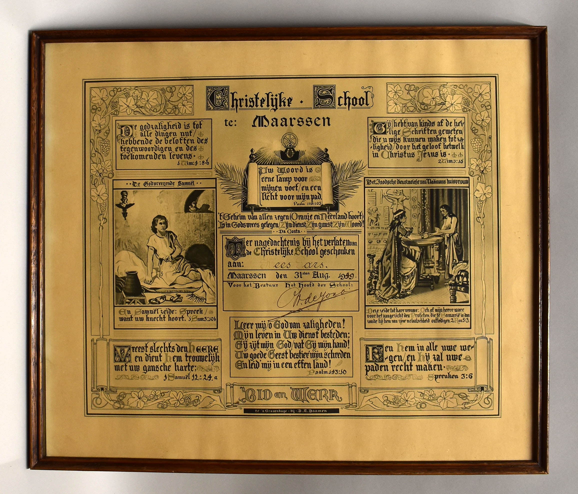 Gedenkplaat t.g.v. verlaten der Christelijke School te Maarssen van Kees Pars met tekst en twee bijbelse voorstellingen