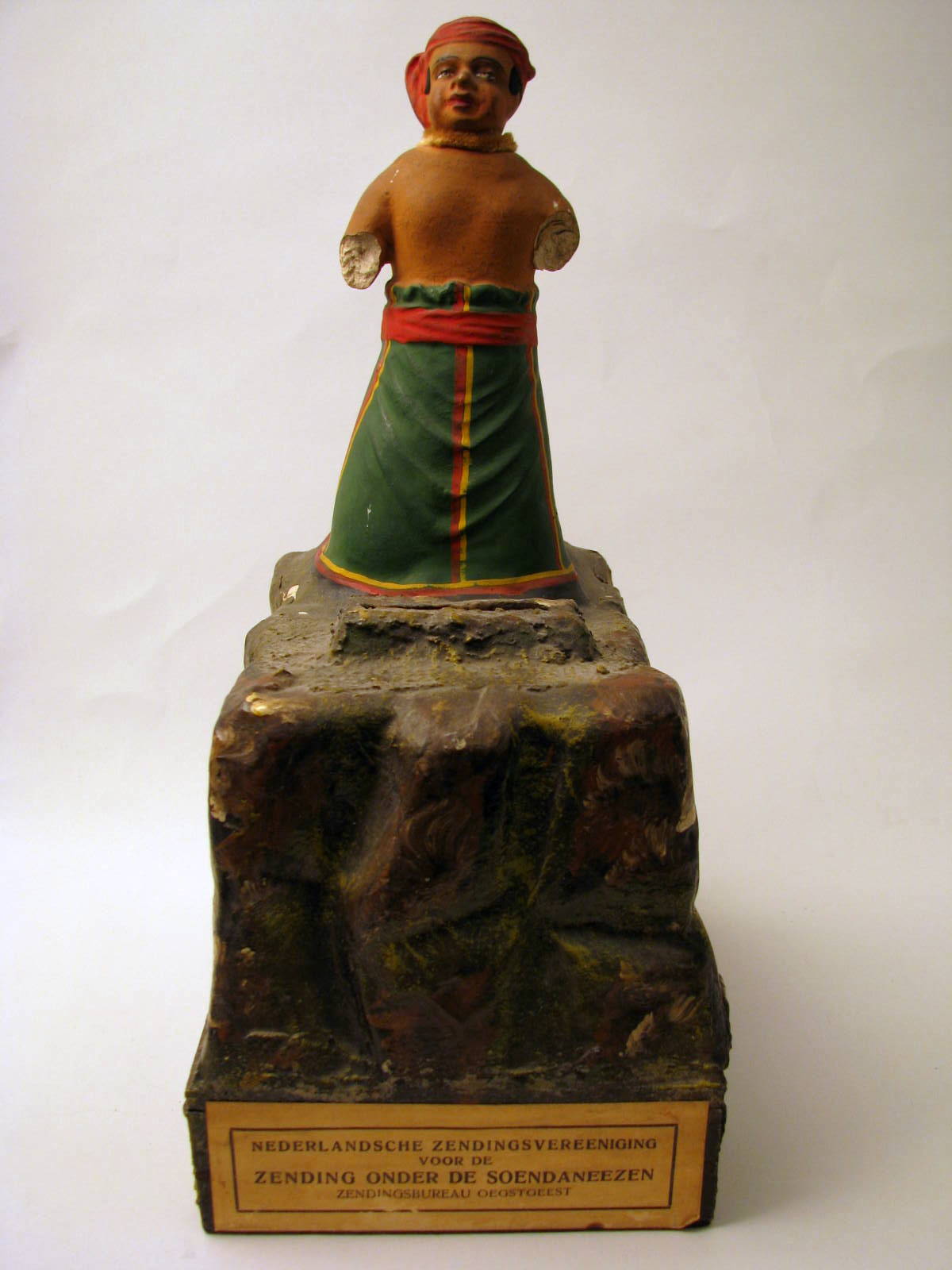 Zendingsbus met knik-Soendanees, met "Nederlandsche zendingsvereeniging ... Soendaneezen"